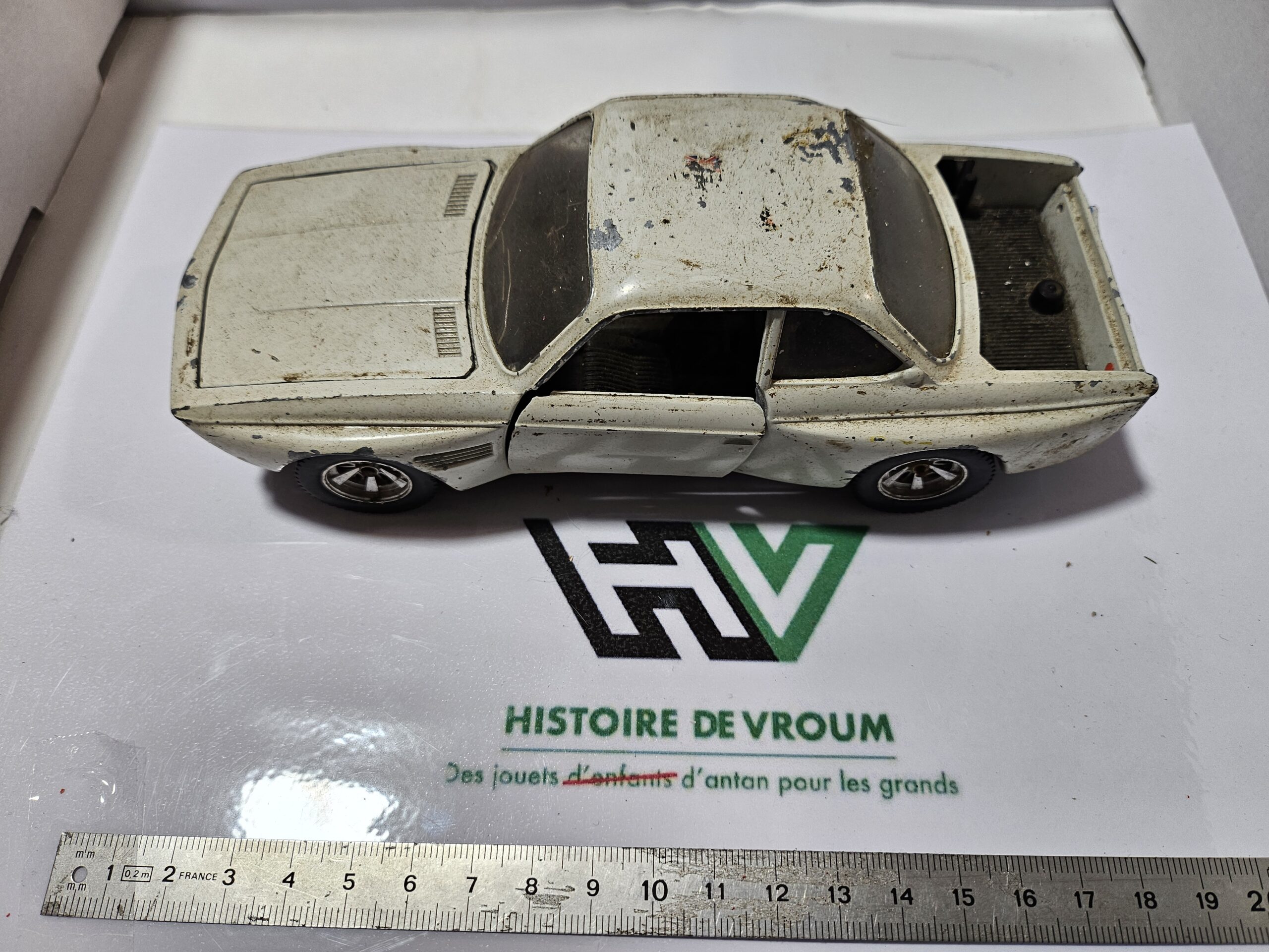 Carrosserie : Métal, peinture blanche d’origine présentant de nombreux éclats et manques (patine prononcée).
