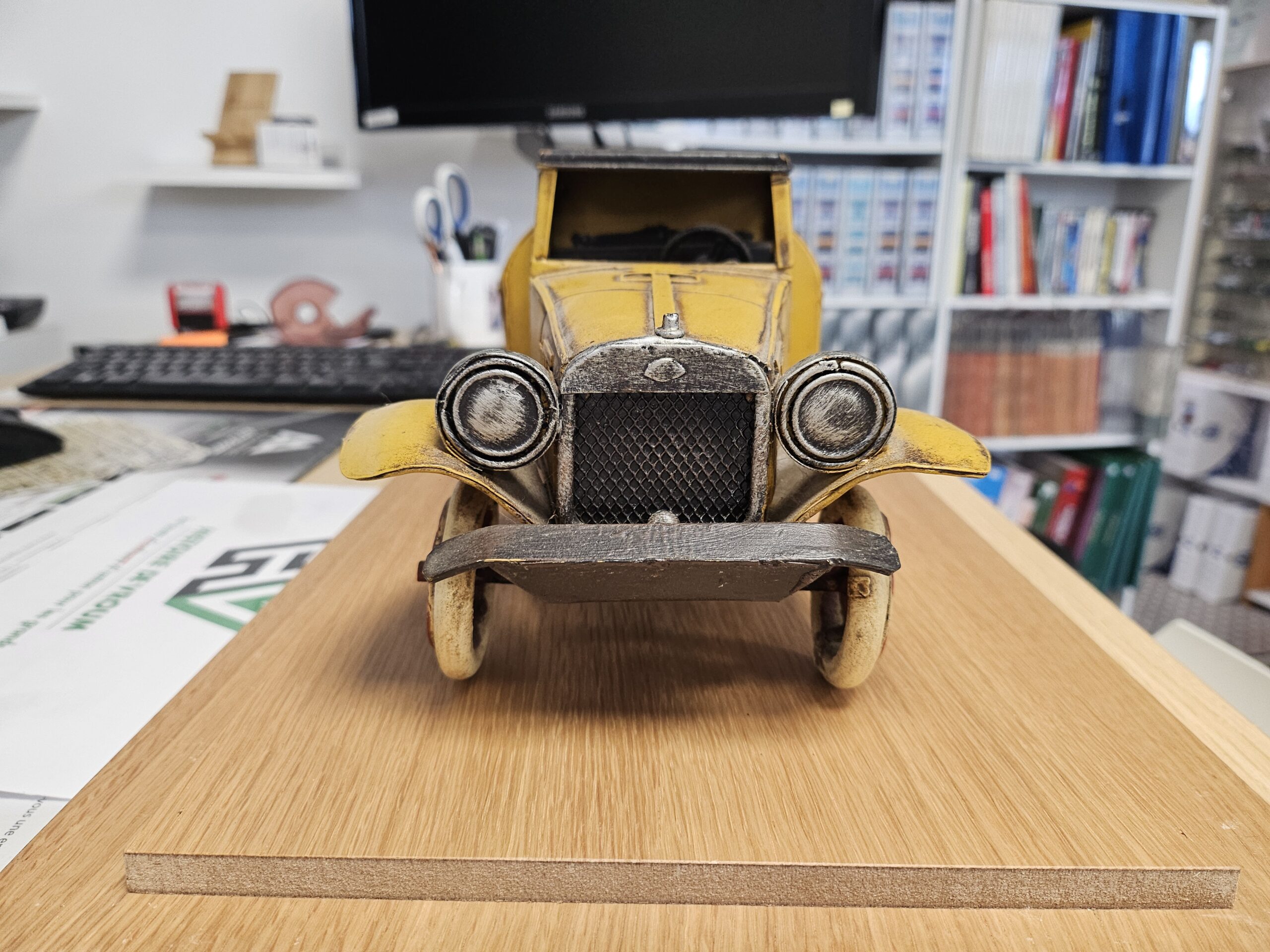 D’une longueur impressionnante de 40 cm, cette miniature se distingue par son look rétro, sa livrée jaune éclatante et ses finitions chromées soignées. C’est l’objet idéal pour une décoration de type “Loft”, “Garage” ou pour un passionné de mécanique.