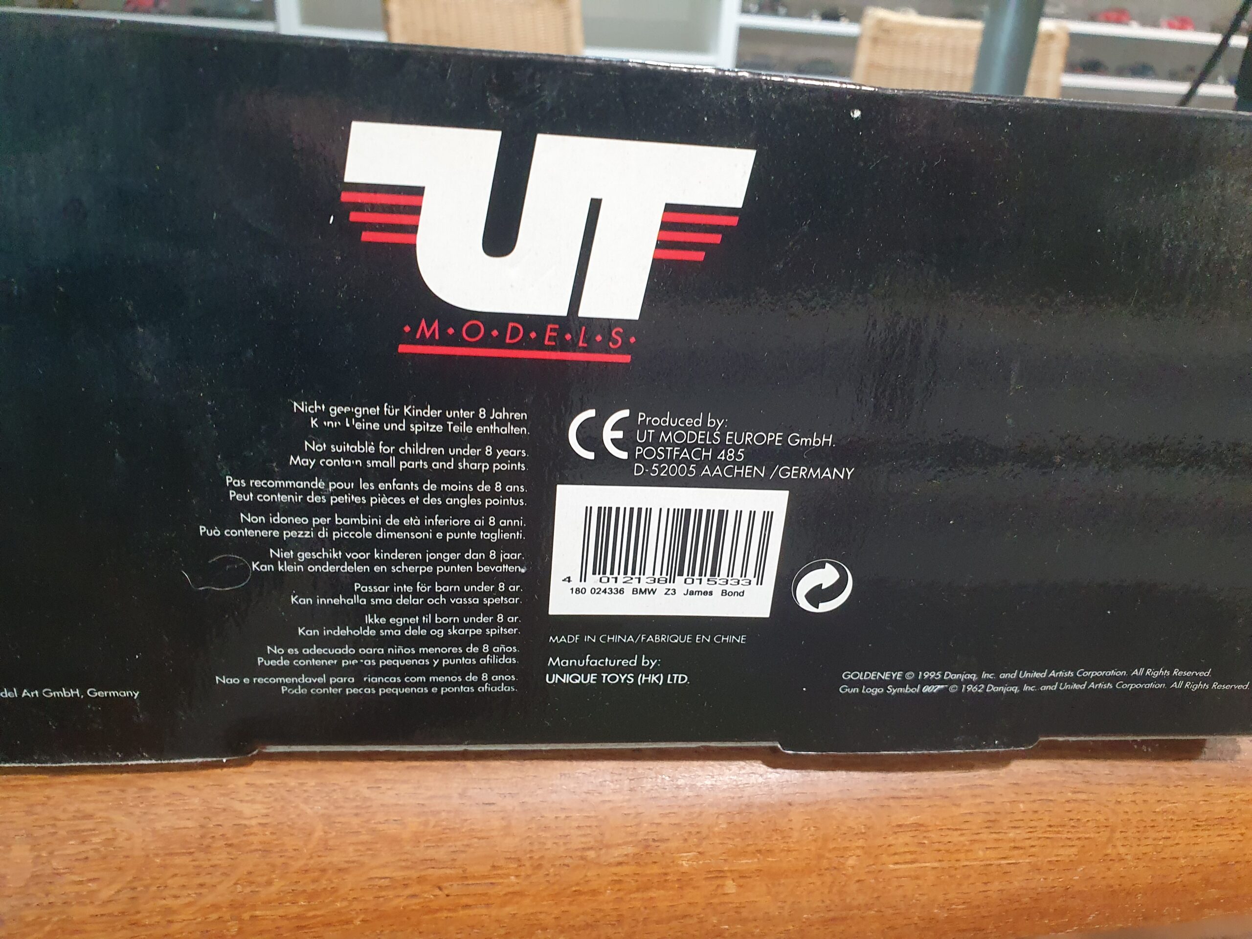Il s’agit du célèbre BMW Z3 Roadster conduit par Pierce Brosnan (alias 007) dans le film Goldeneye (1995). Ce modèle est particulièrement prisé car il a été produit par UT Models (souvent associé à Minichamps pour cette édition), un fabricant reconnu pour son niveau de détail supérieur à celui des modèles standards.