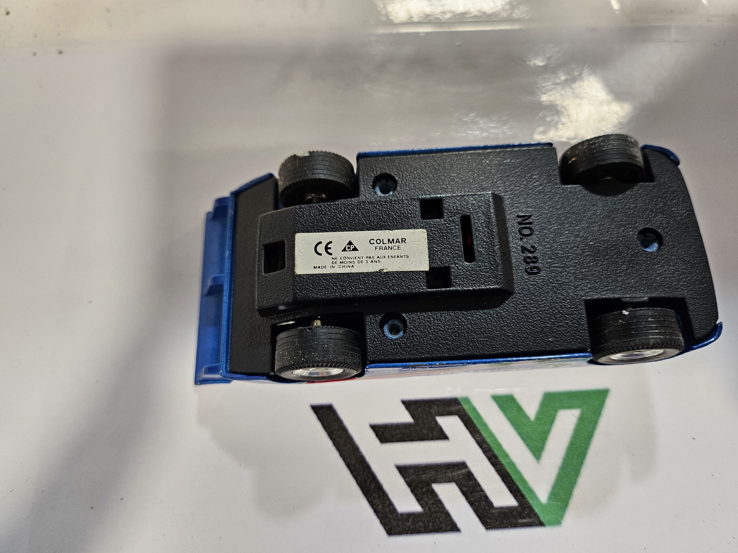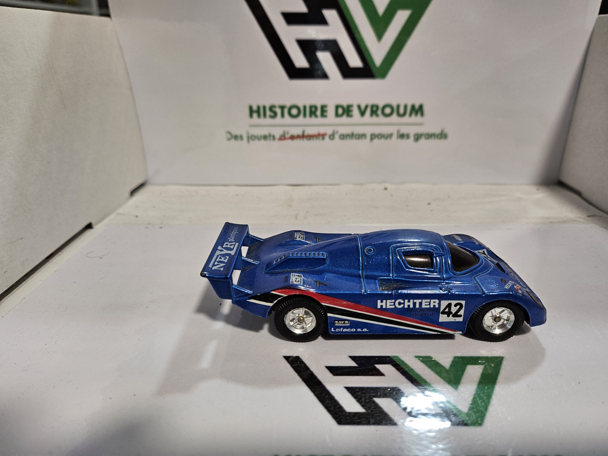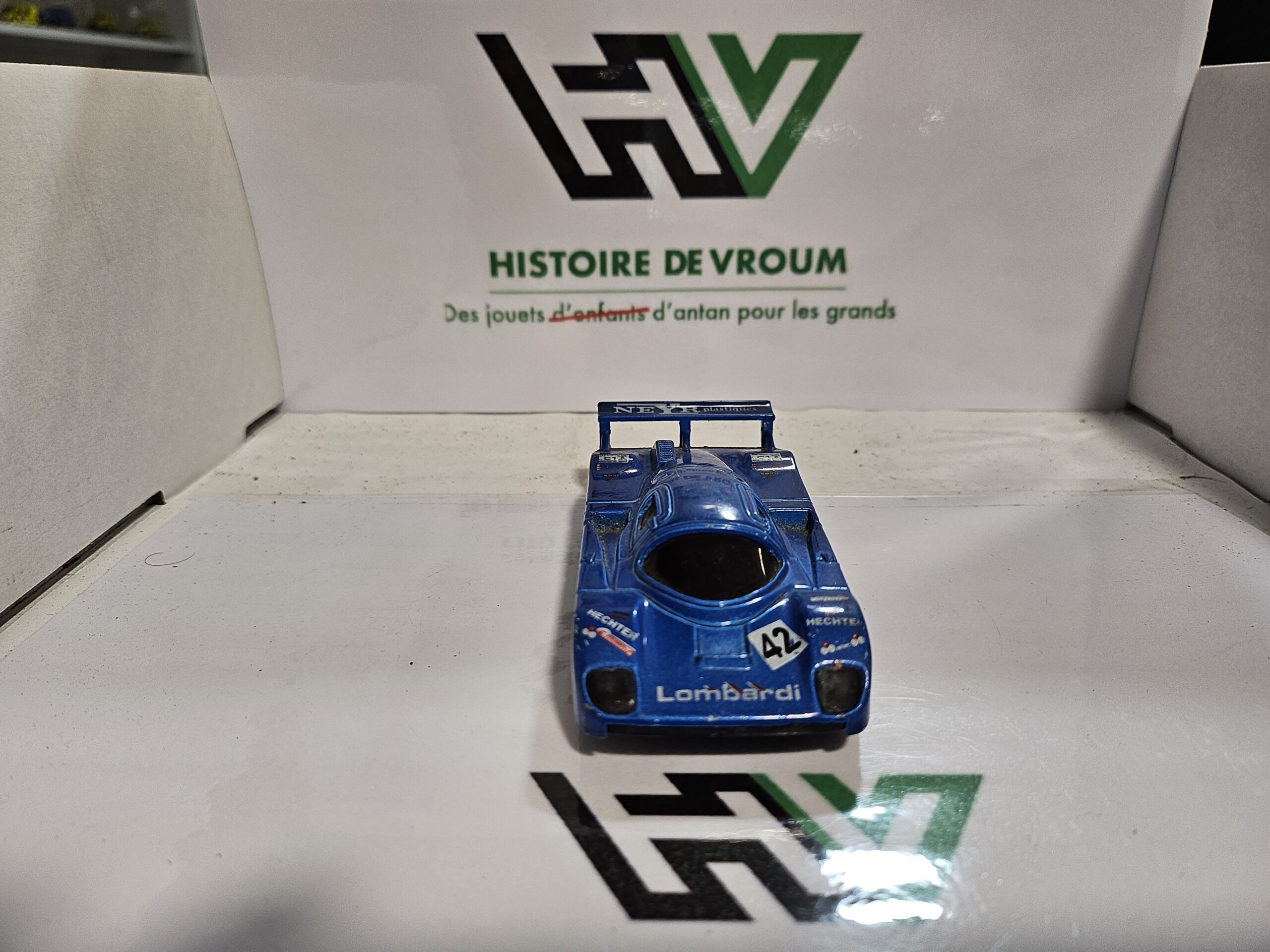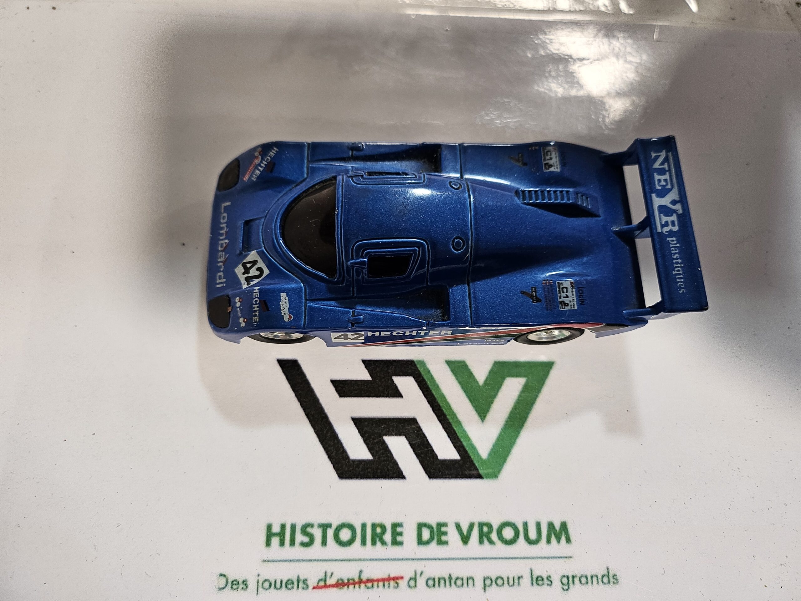 État : Très bel état de conservation pour ce modèle “vintage”. La peinture bleu métallisé est éclatante et les décals sont complets (Hechter, Lombardi, Neyr Plastiques, BP).