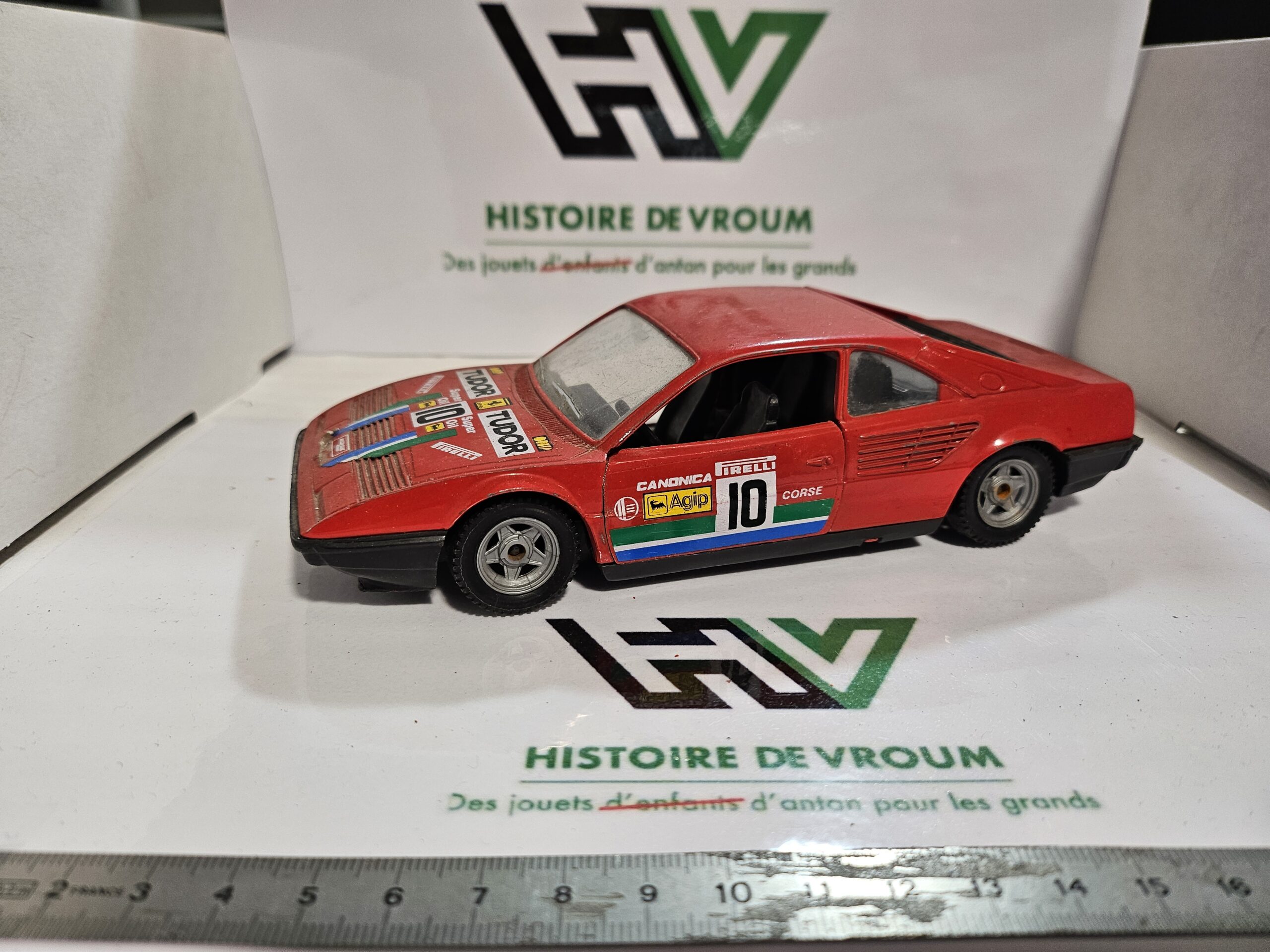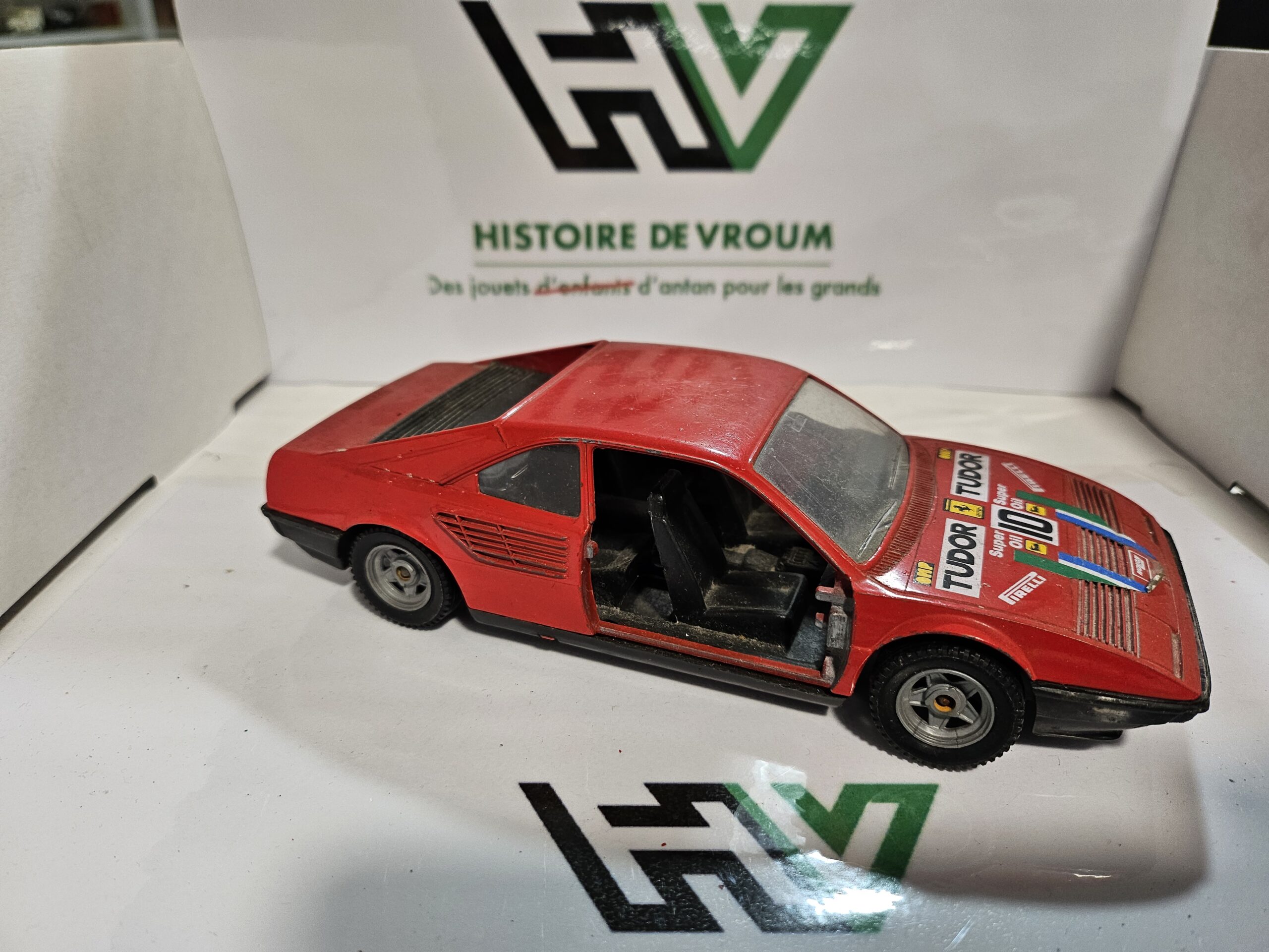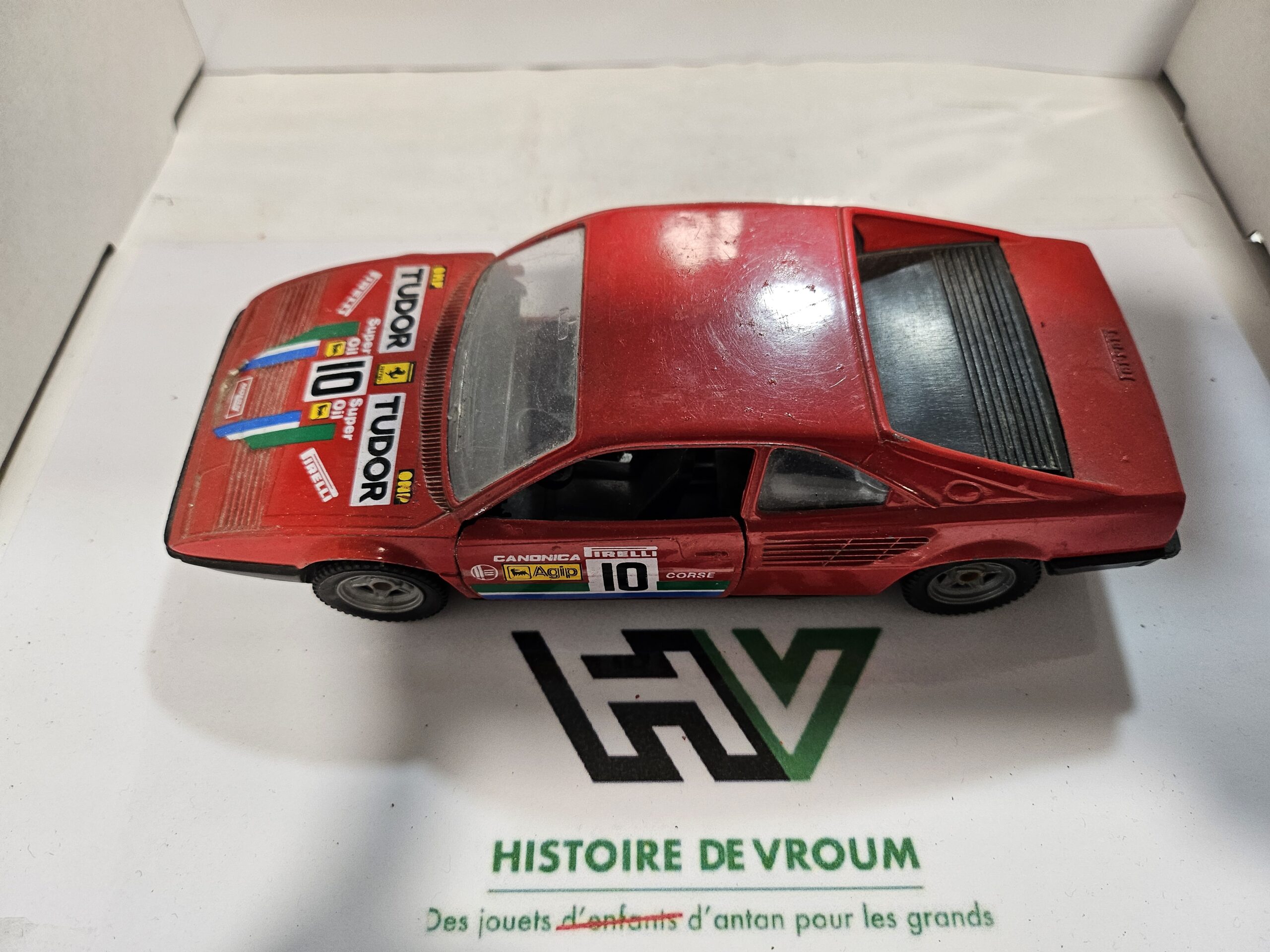 • Points à noter : Manque la portière conducteur, peinture usée par le temps, décalcomanies d’époque (course Tudor/Agip/Pirelli) avec manques.