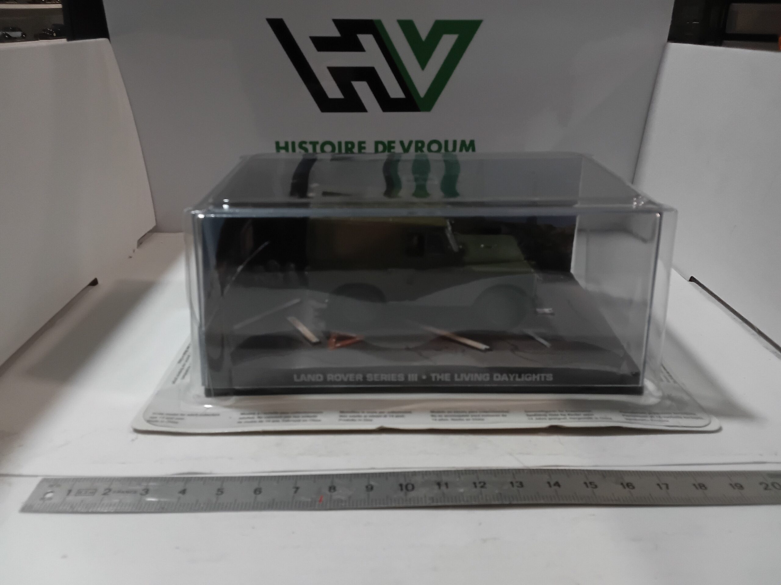 Ce modèle fait partie de la Collection James Bond Car Collection (souvent le Numéro 45) et a été fabriqué par Eaglemoss (moule Universal Hobbies / IXO). Il représente le Land Rover vert/kaki utilisé par un assassin pour tenter de s’échapper à Gibraltar pendant la séquence pré-générique avec Timothy Dalton dans le rôle de 007.