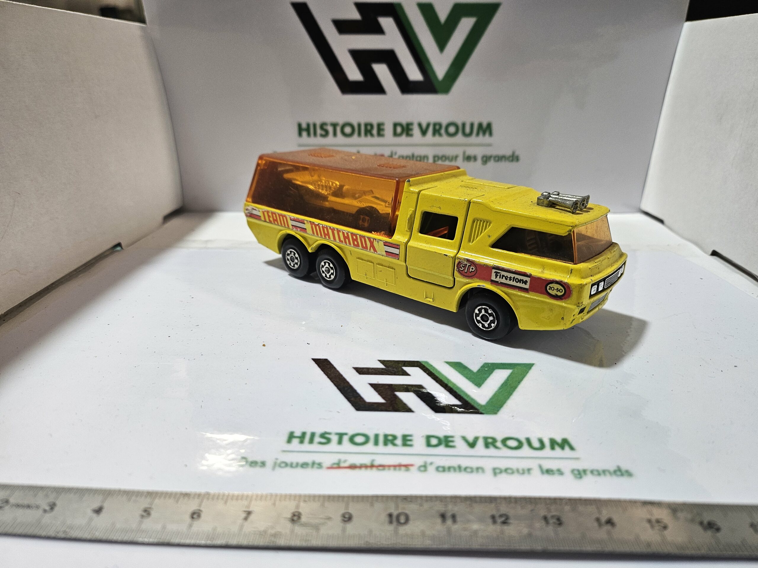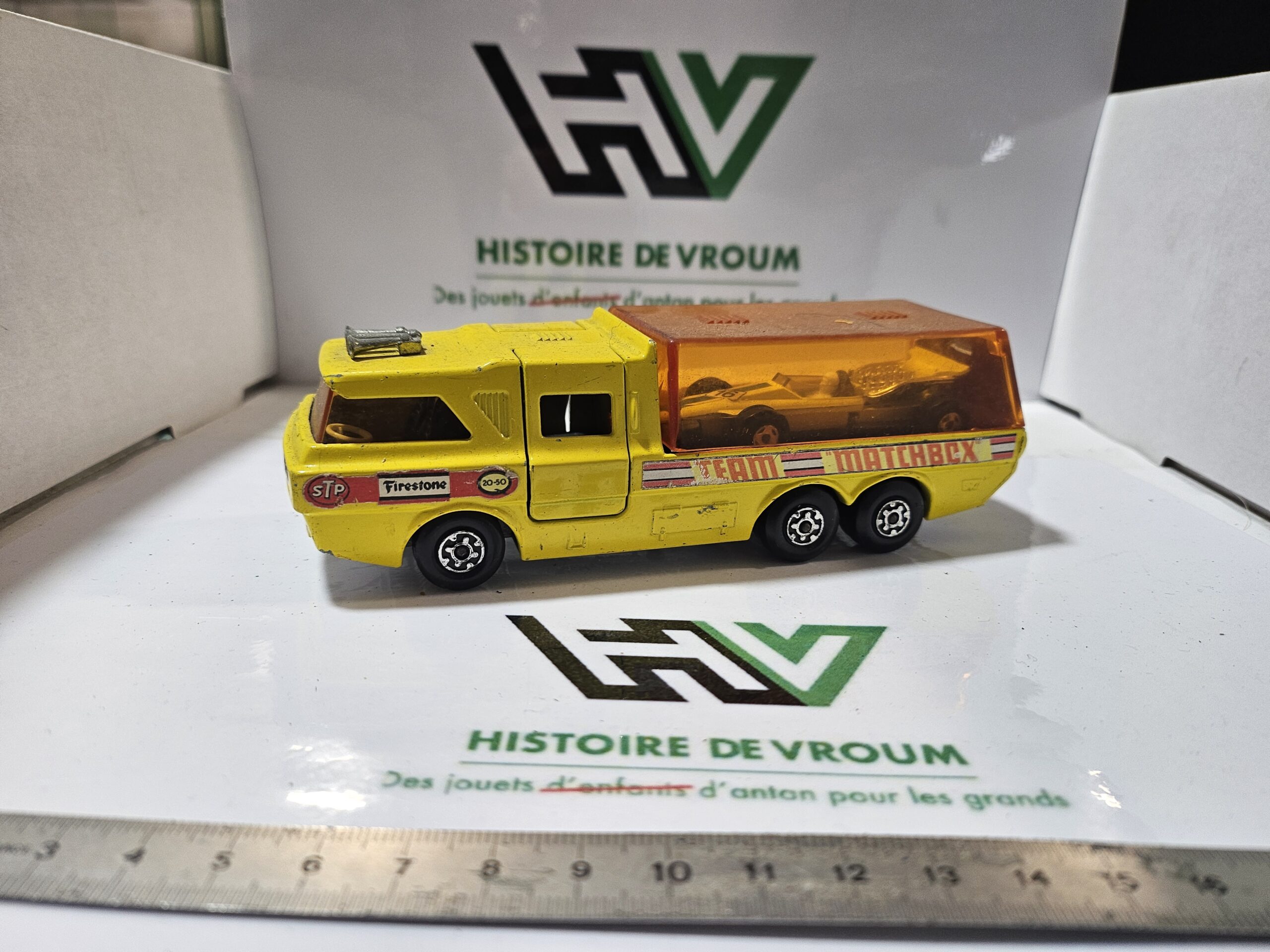 Points positifs : La bulle orange est présente (souvent cassée ou manquante), les autocollants latéraux “Team Matchbox”, “STP” et “Firestone” sont encore en bon état, et surtout, la voiture de course est présente à l’intérieur.