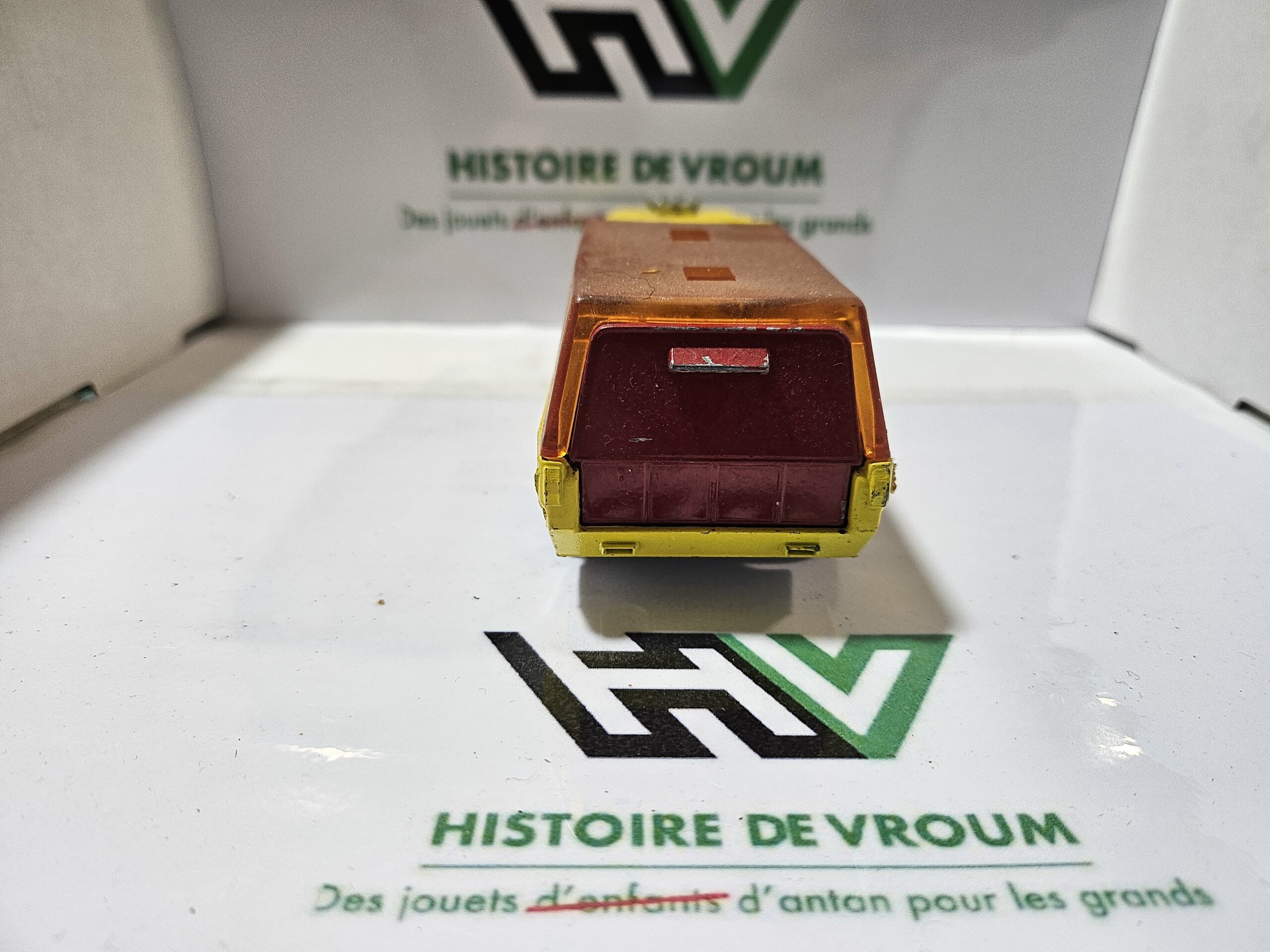 État : Bel état vintage “joué”. La peinture présente quelques traces d’usage normales pour son âge (voir photos). Les vitres et les roues sont en excellent état. Le mécanisme de la rampe arrière est fonctionnel.