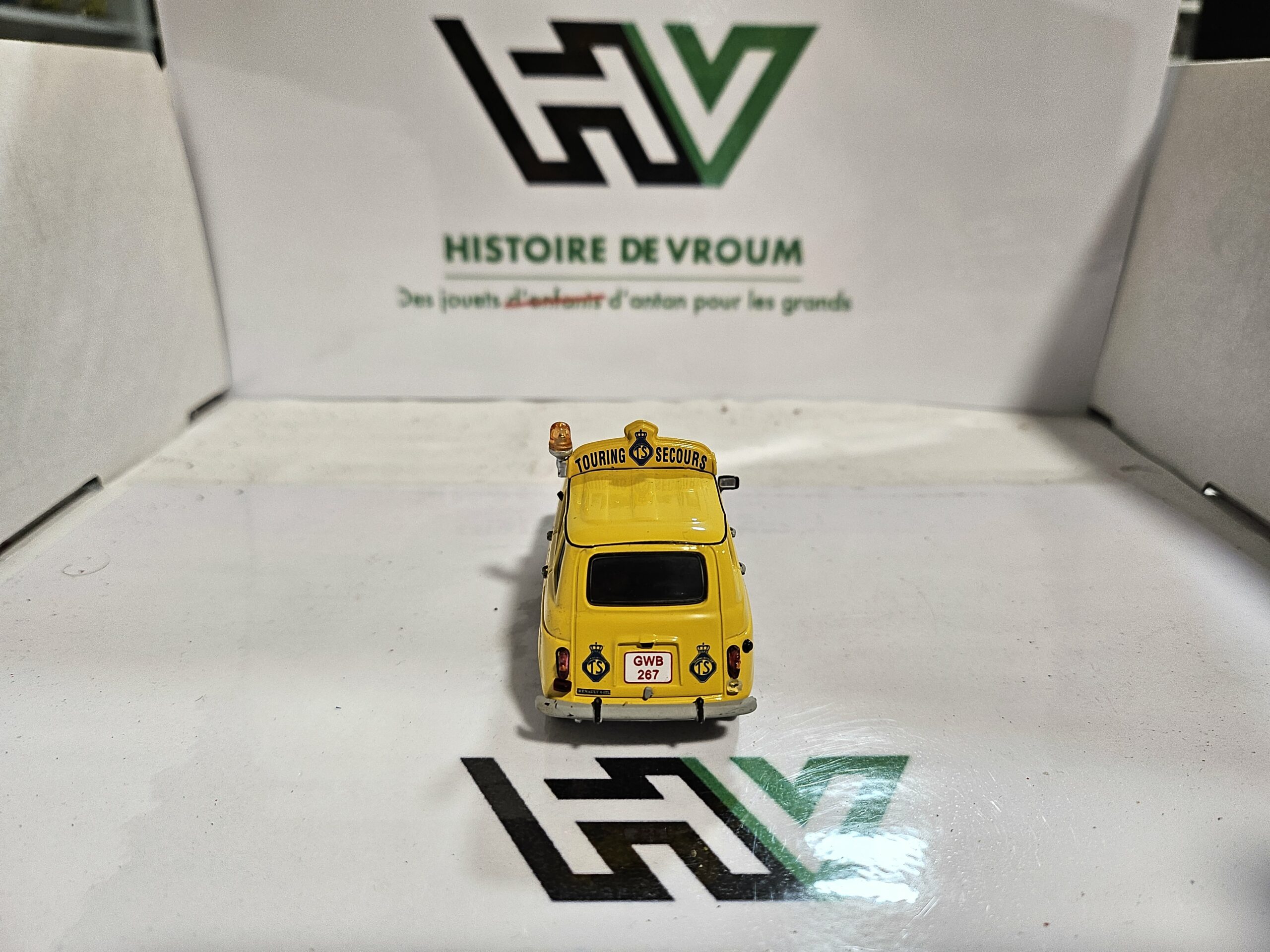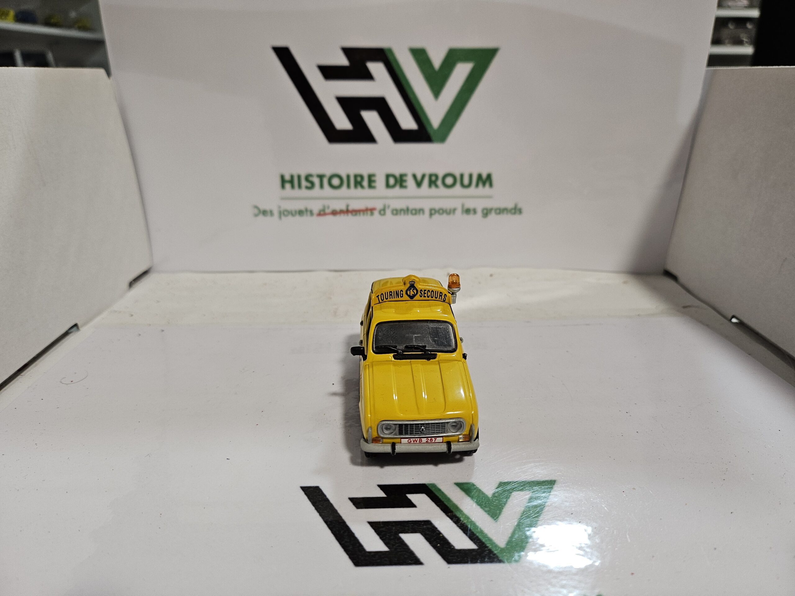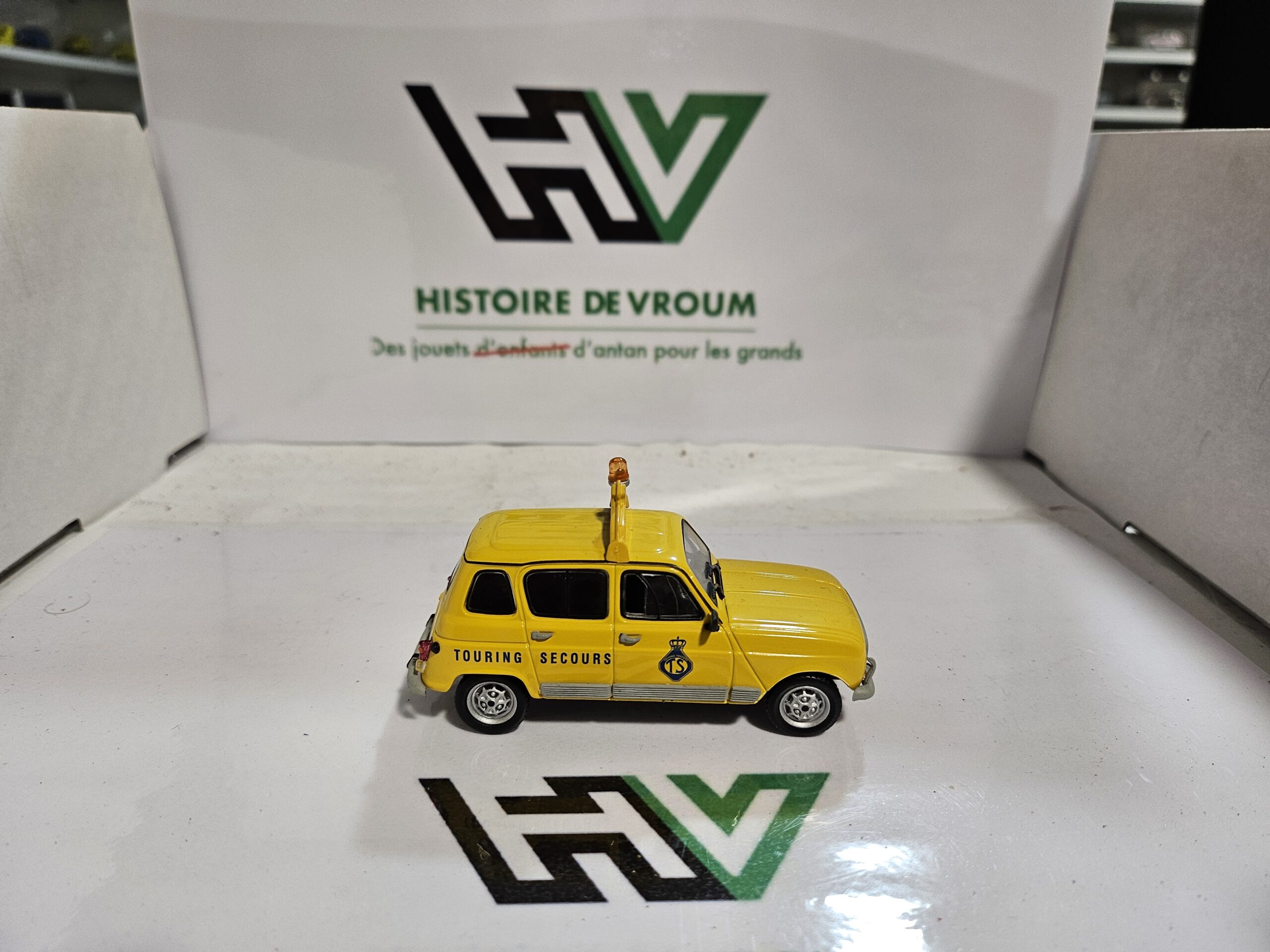 À saisir, superbe reproduction au 1/43 de la mythique Renault 4 (4L) de 1968 aux couleurs de Touring Secours (Assistance belge).