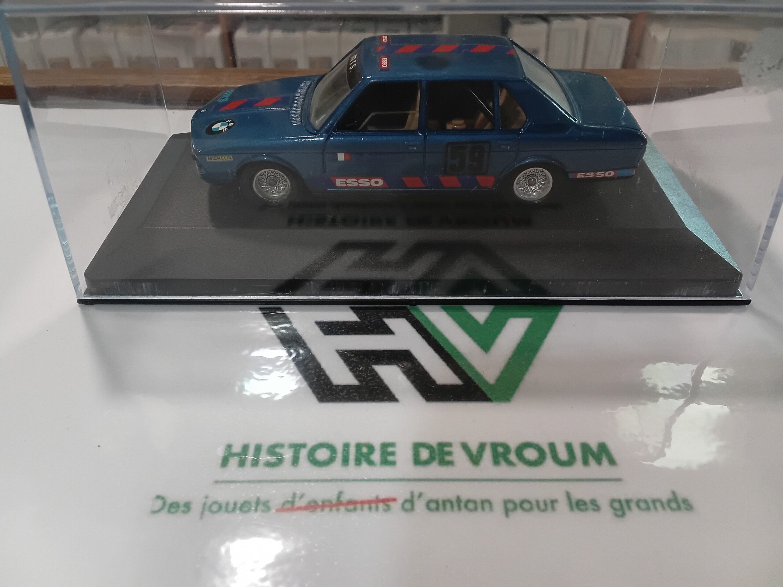 - État : Très bon état général pour une miniature d’époque. Elle est présentée dans un boîtier d’exposition (Histoire de Vroum). Les détails (jantes, décorations) sont bien conservés.