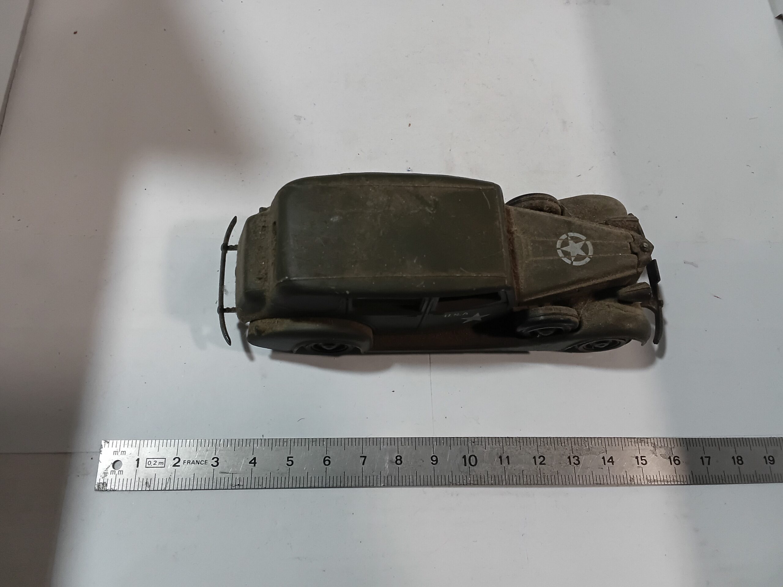 | Particularités | Ce modèle se distingue par l’absence de chromes brillants (souvent peints en vert ou noir pour le camouflage). Elle comporte généralement des marquages militaires (étoiles blanches de l’US Army) sur les portières ou le capot. C’est une pièce de choix pour les collectionneurs de militaria et de véhicules de la Seconde Guerre mondiale. |
