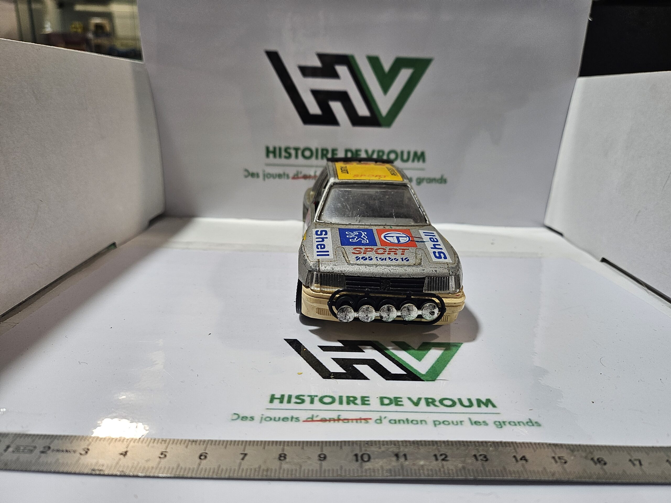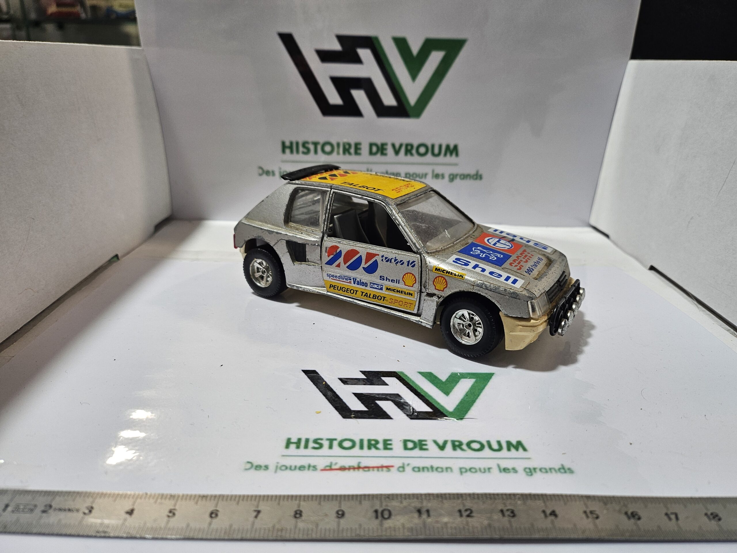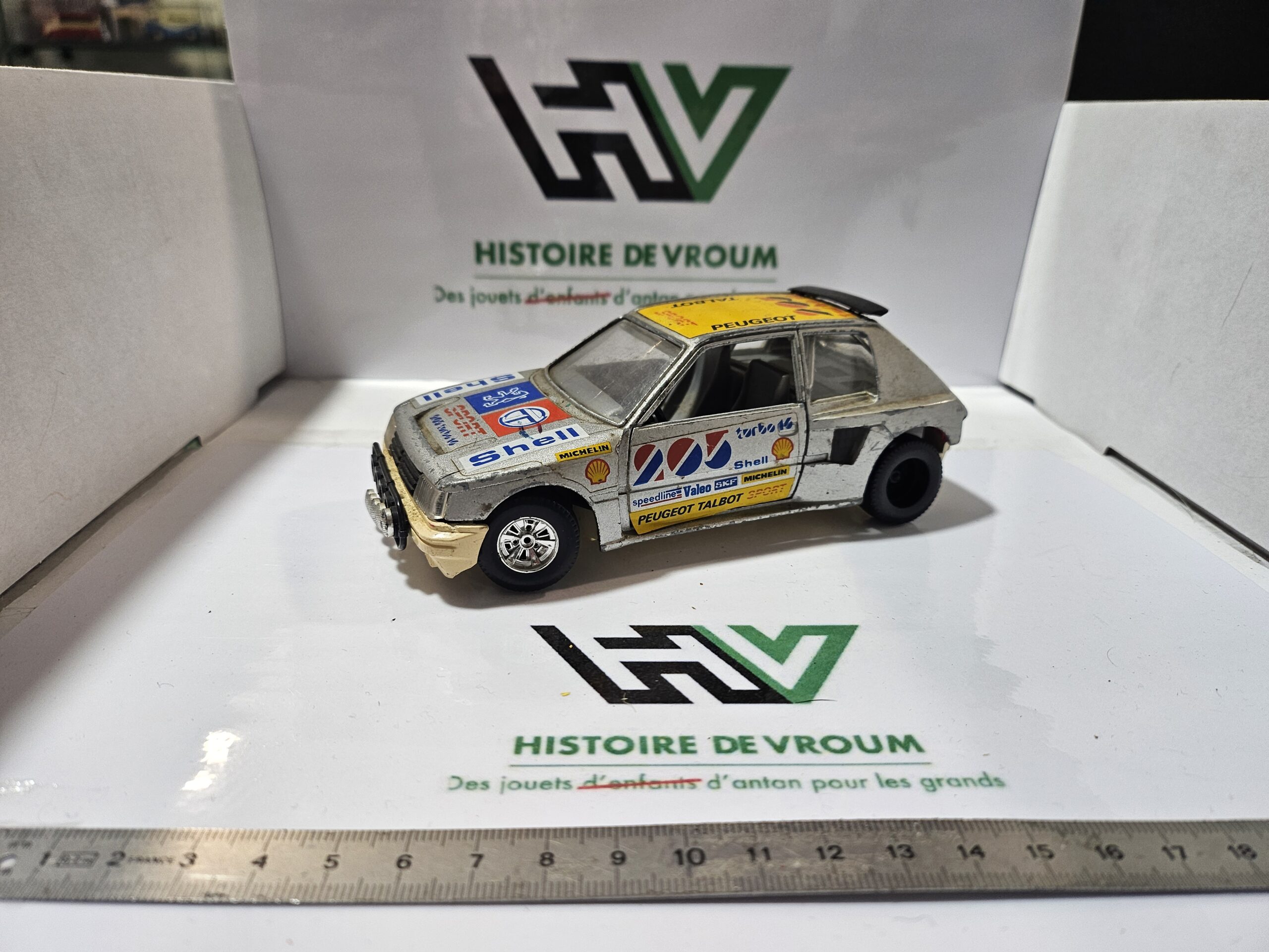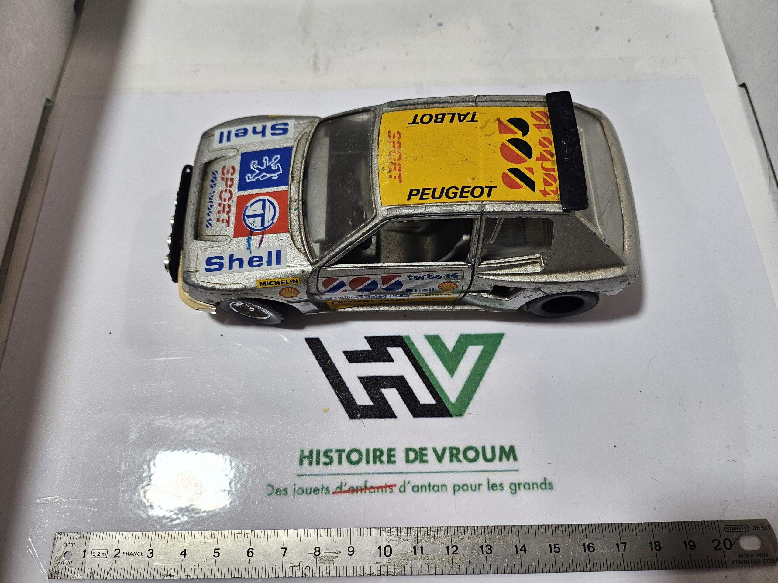 Carrosserie : Présence de toutes les décalcomanies d’origine (Shell, Michelin, Peugeot Talbot Sport), mais avec des marques d’usure et des manques par endroits.