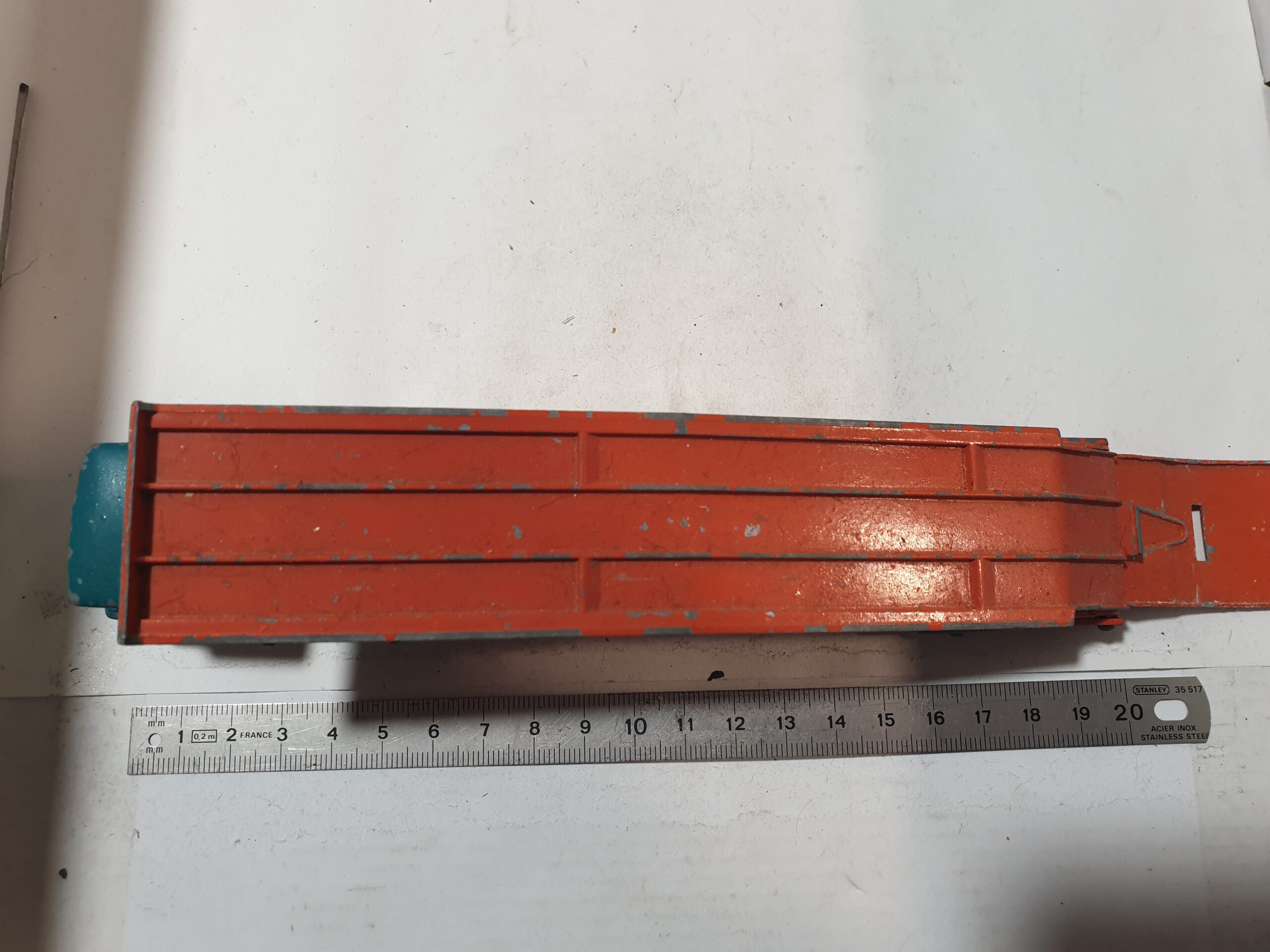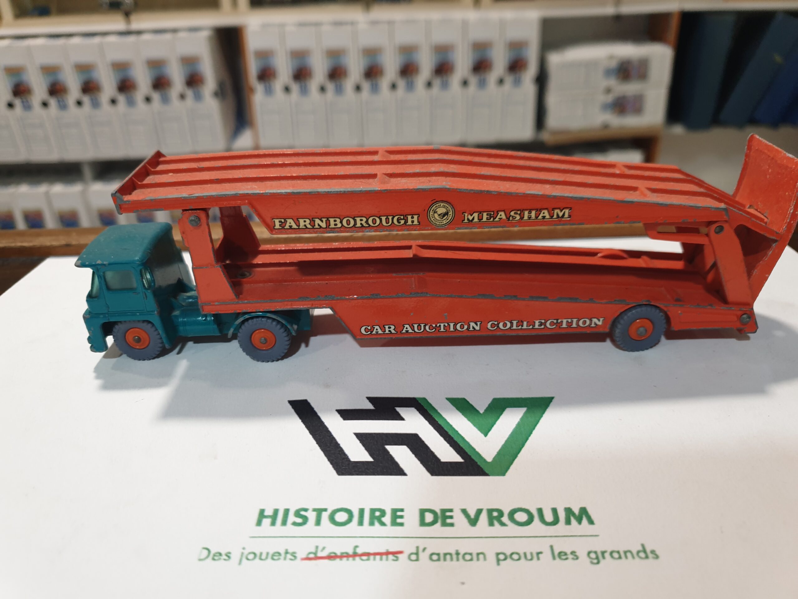 Cette miniature est en bon état général de conservation pour son âge. Le tracteur, de couleur vert-bleu, et la remorque, orange-rouge, conservent bien leurs couleurs d’origine. Les marquages “Farnborough Measham” et “Car Auction Collection” sur les côtés de la remorque sont clairs et bien lisibles, ce qui est un atout majeur pour ce modèle souvent usé. [Précisez ici les petits défauts : “Quelques légers éclats de peinture sont à noter sur le tracteur et sur les bords de la remorque, mais sans altérer l’ensemble.”] Le mécanisme de levage de la rampe supérieure est [précisez : “fonctionnel et sans problème” / “un peu rigide mais fonctionnel”]. Toutes les roues sont présentes et roulent correctement.