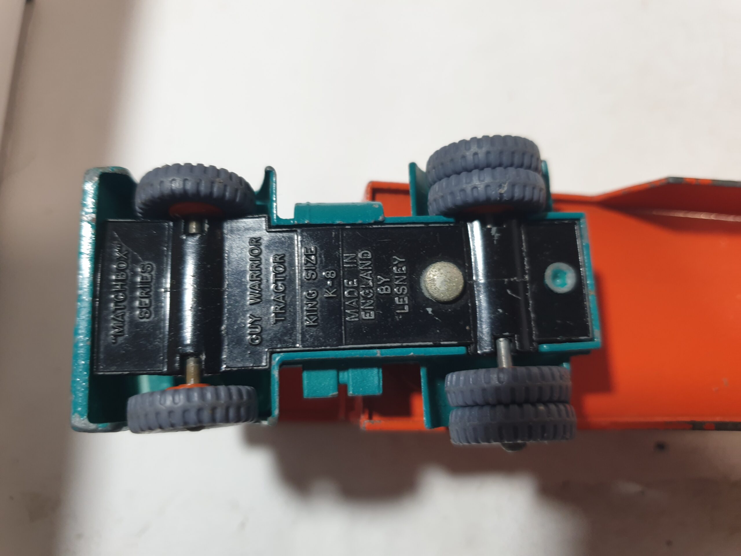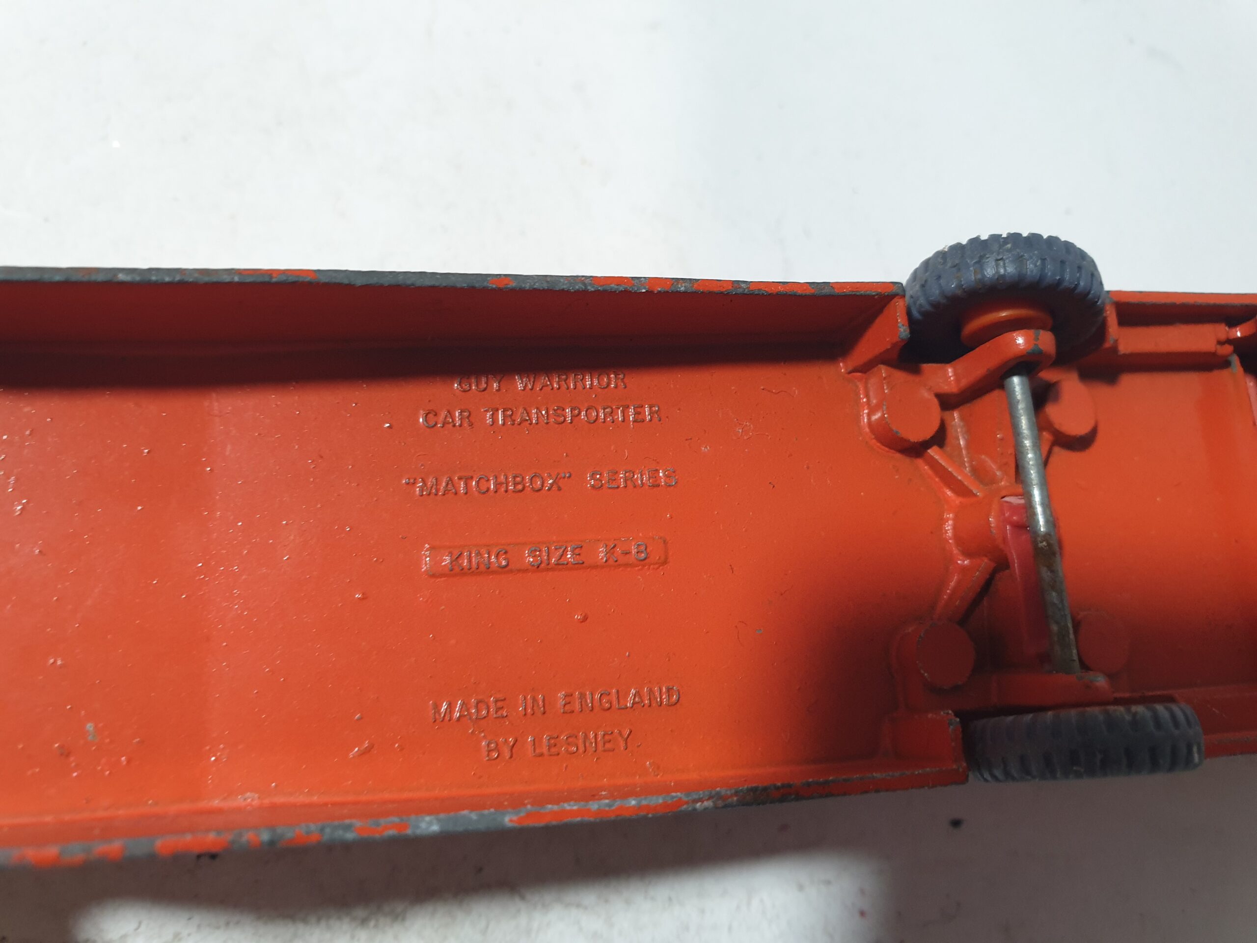À vendre, une pièce maîtresse pour tout collectionneur de miniatures vintage : le Matchbox King Size K-8 (ou Major Pack M-8 selon la version exacte) Car Transporter, arborant les célèbres marquages “Farnborough Measham” et “Car Auction Collection”. Ce transporteur de véhicules iconique est un témoignage des productions Matchbox des années [précisez les années si vous les connaissez, souvent fin 60s/début 70s].