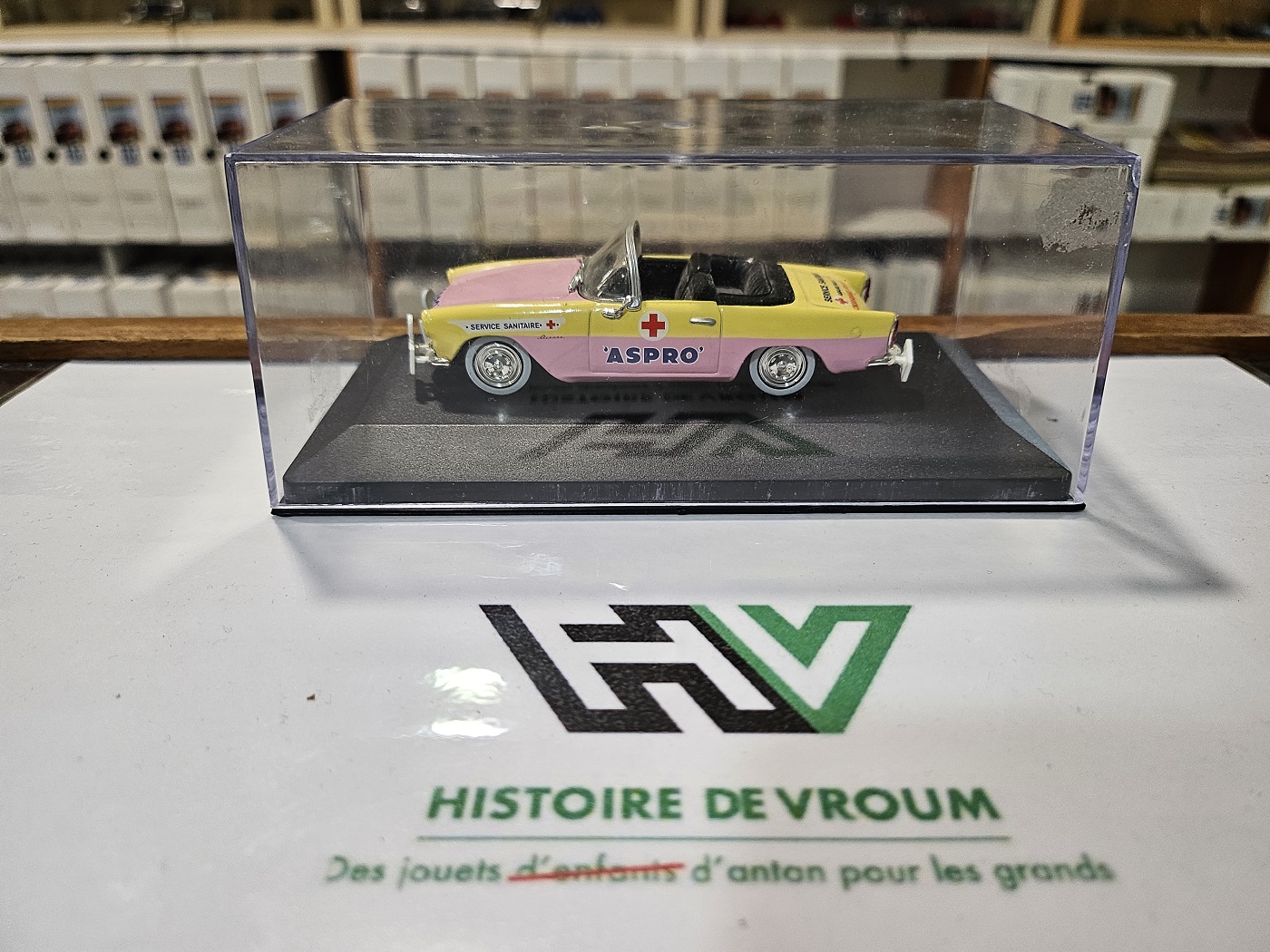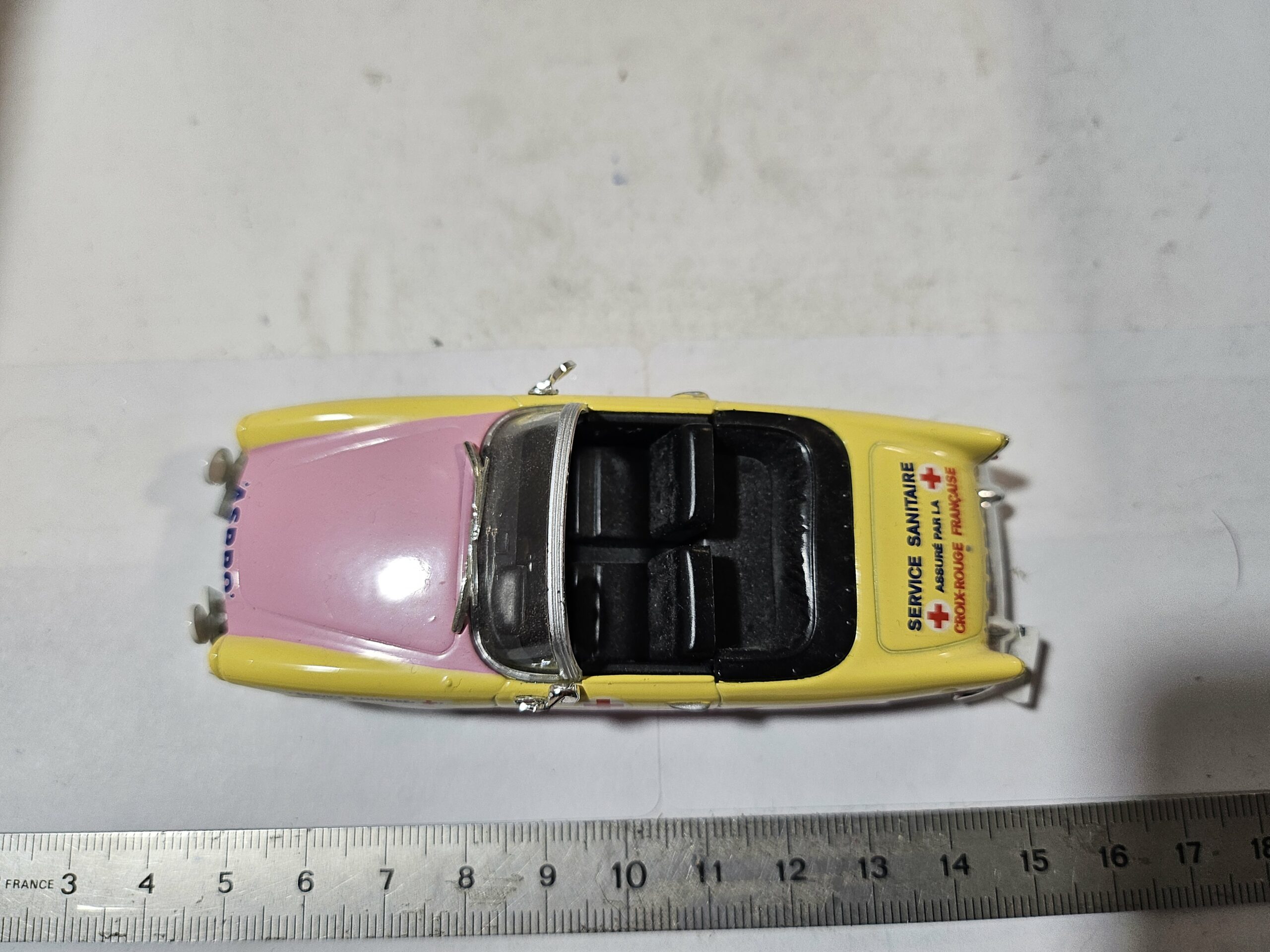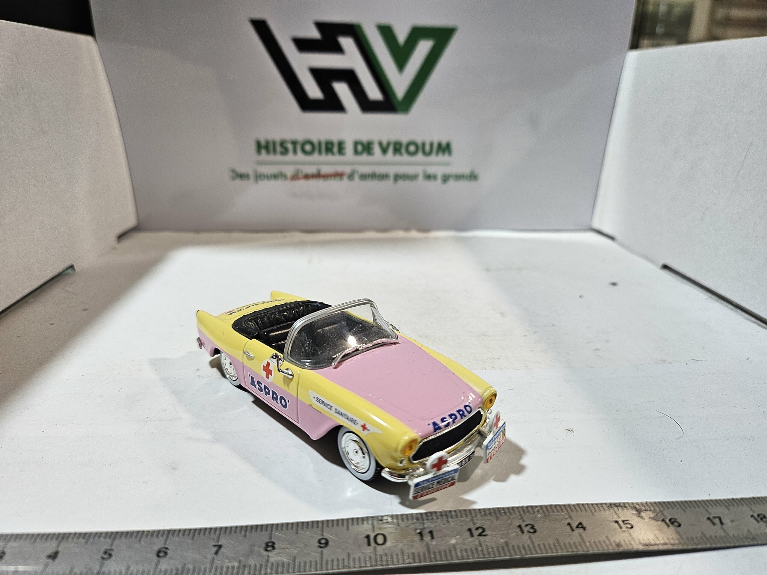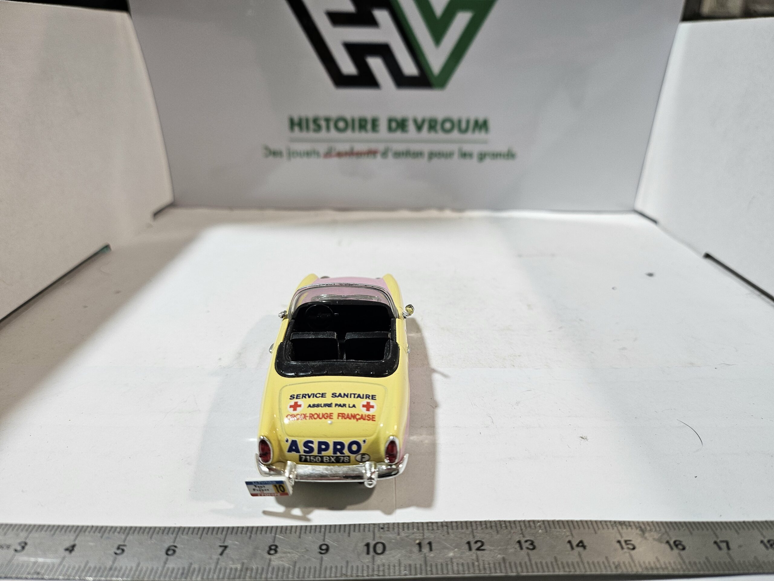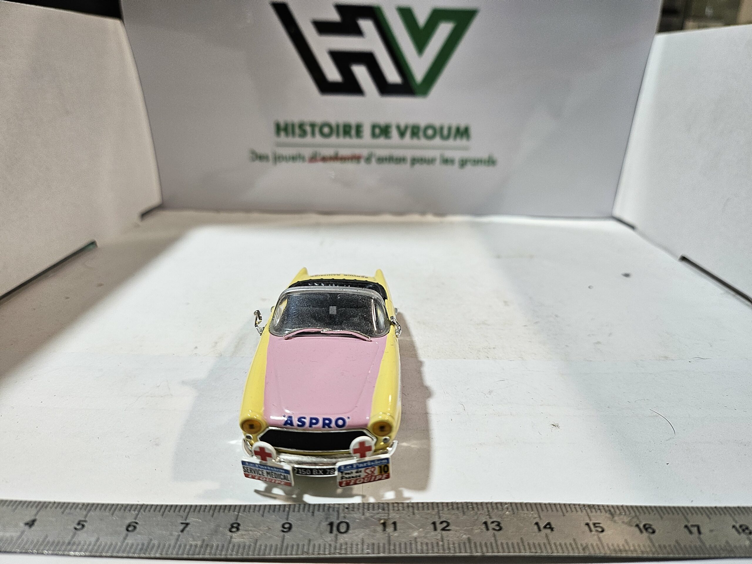 Ajoutez à votre collection cette Simca Océane aux couleurs vives et reconnaissables du célèbre médicament ASPRO, utilisée comme véhicule du service sanitaire sur le Tour de France. La carrosserie jaune pâle et rose bonbon, ornée de la croix rouge et du lettrage “ASPRO Service Sanitaire”, en fait une miniature très recherchée et visuellement frappante.