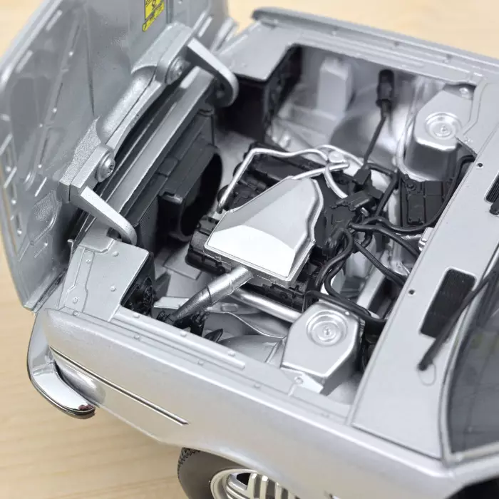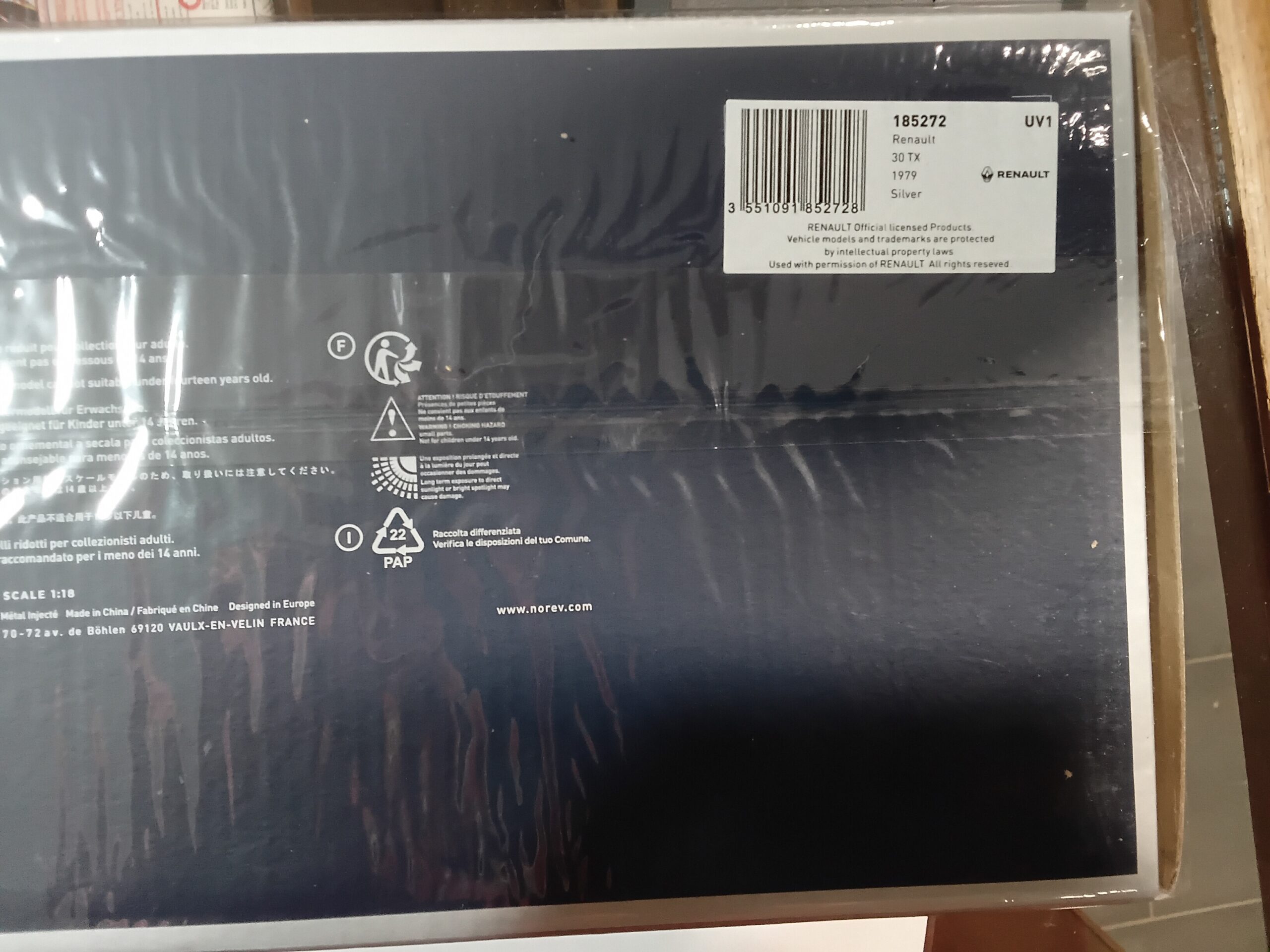 Grâce au capot ouvrant de notre miniature, il est possible d’admirer ce moteur ainsi que l’autocollant publicitaire incitant à « exiger la pièce d’origine » de chez Renault.