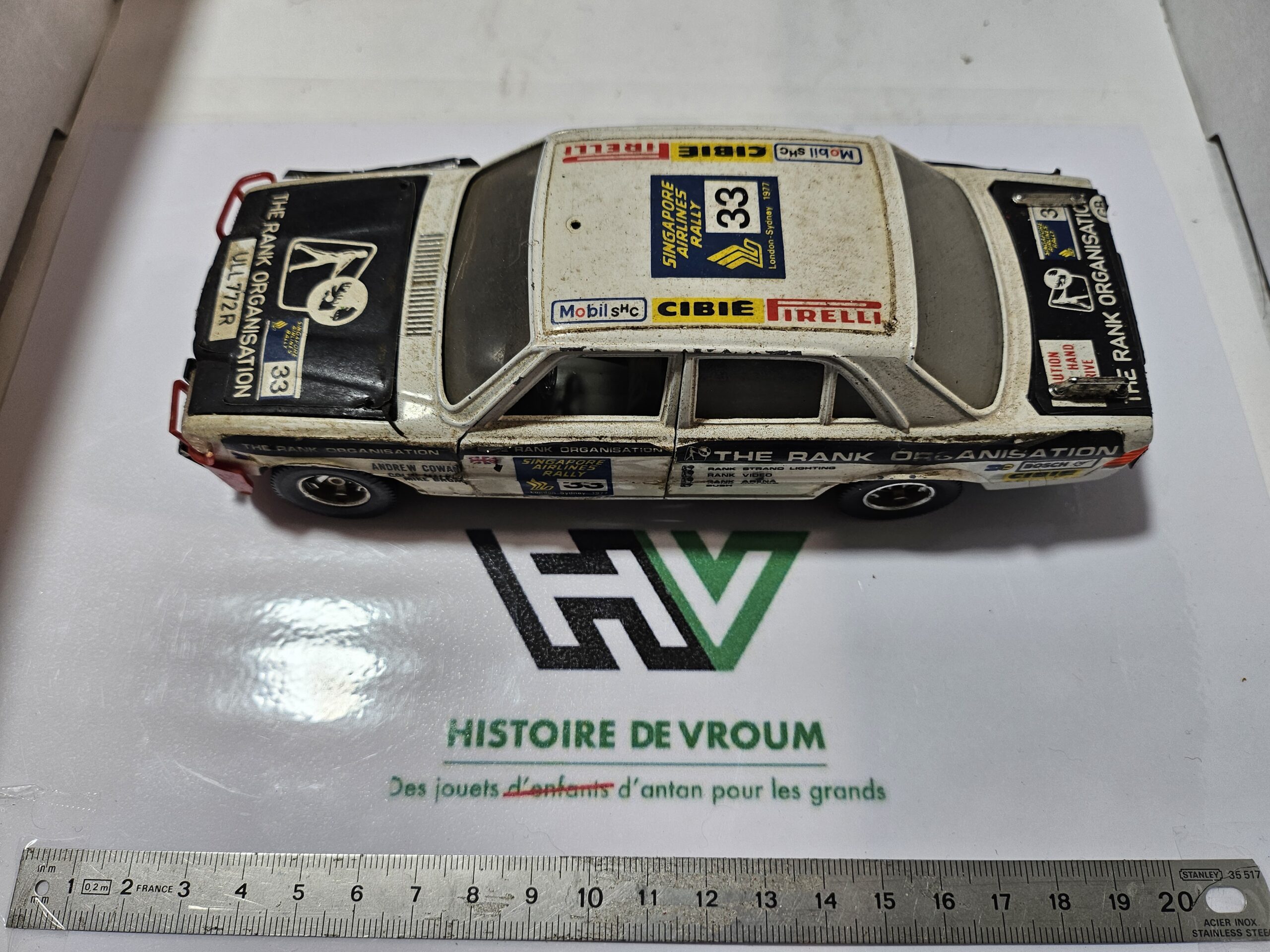 • Carrosserie : Métal, peinture d’origine blanche avec capot noir. Les décalcomanies d’époque (Singapore Airlines, Mobil, Pirelli, Cibié) sont encore bien visibles malgré quelques marques d’usage.