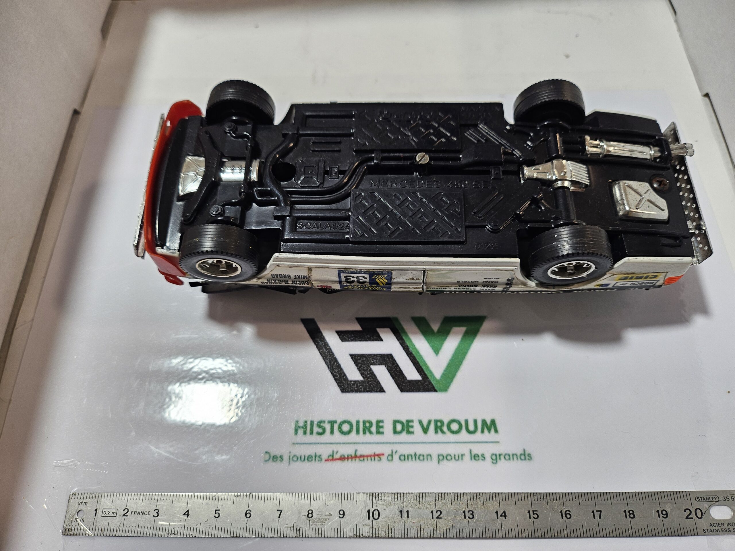 • Châssis : Plastique noir, référence 0122, mentionnant “Mercedes 450 SEL” et “Made in Italy”.