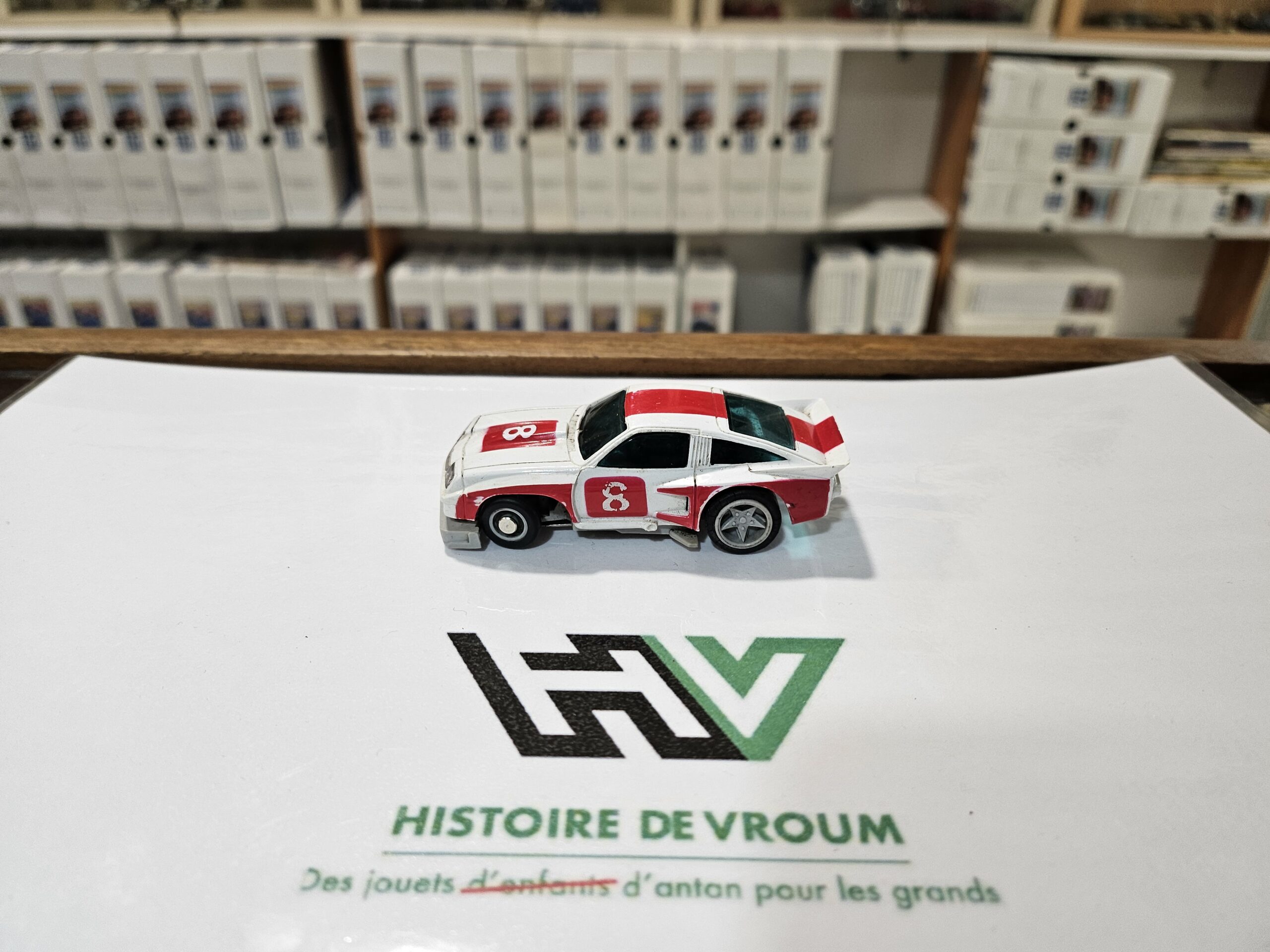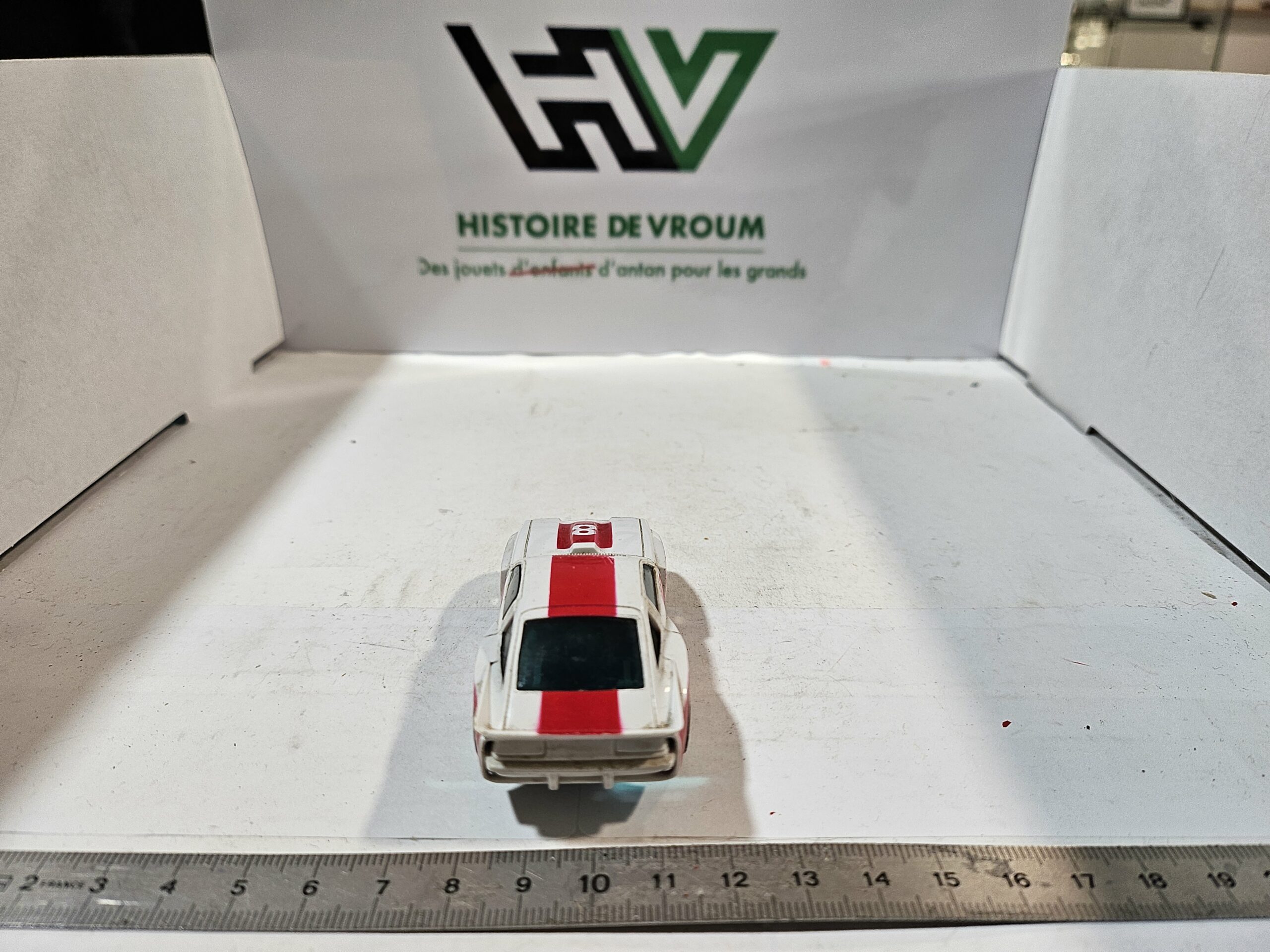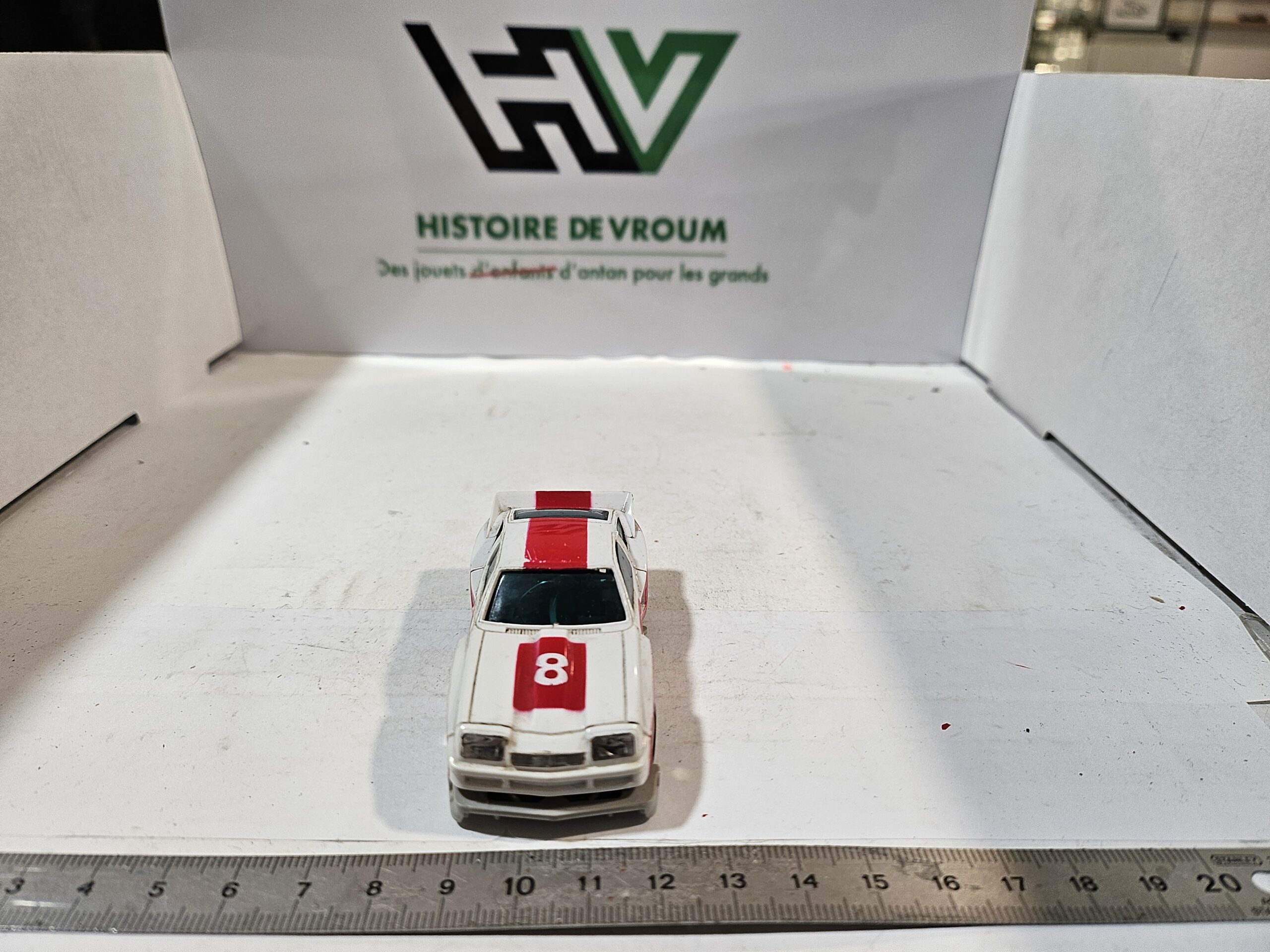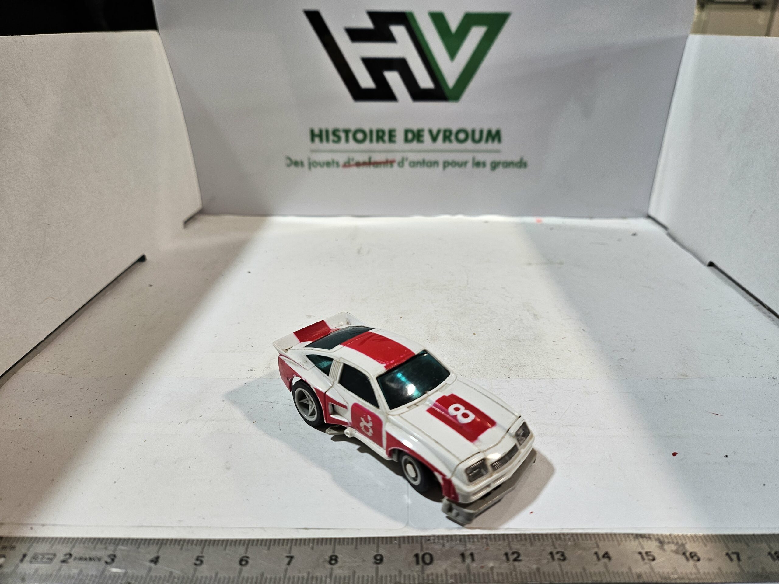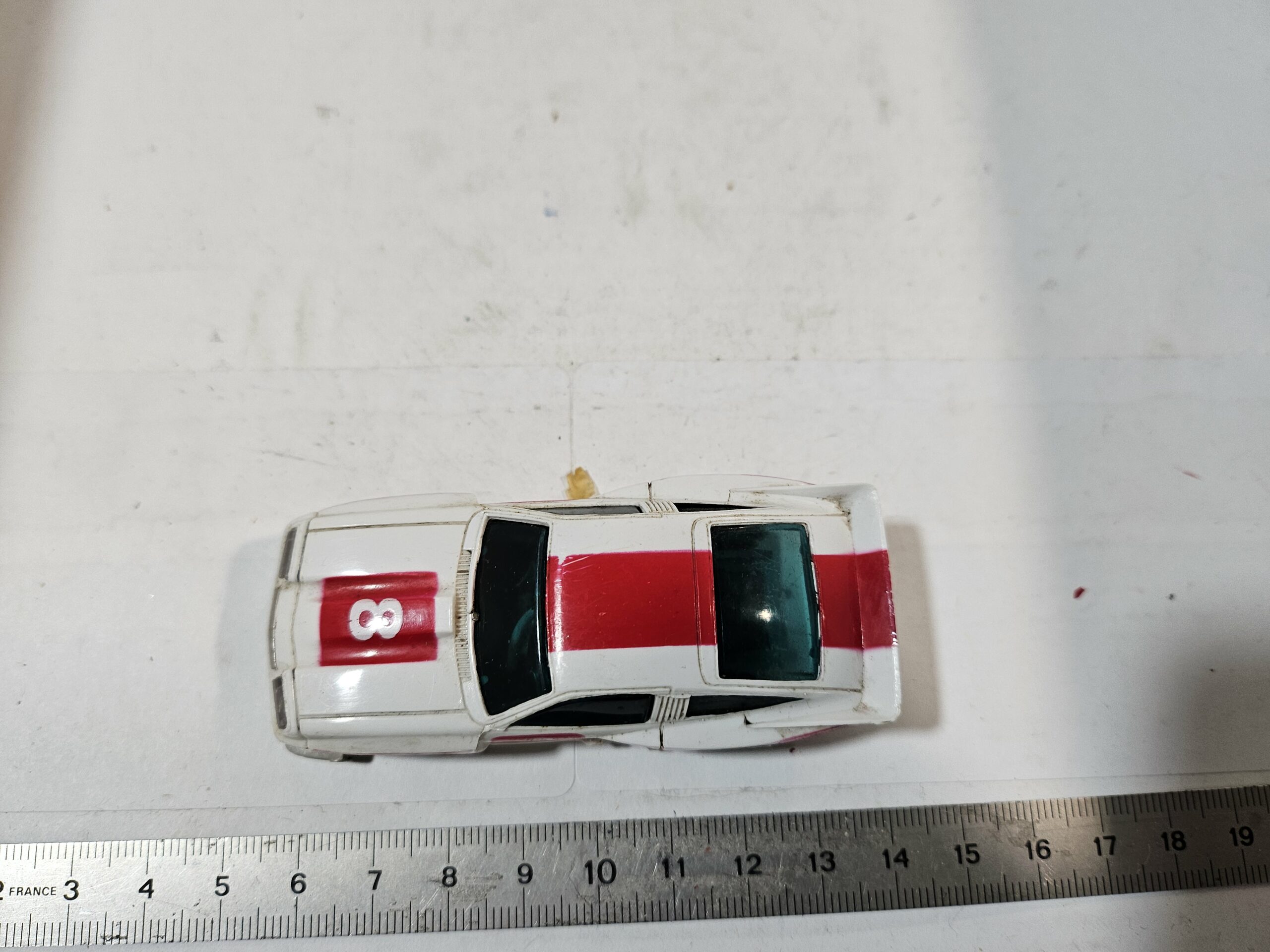 État visuel : La carrosserie présente des traces d’usure (peinture rouge un peu frottée sur les ailes et le toit), mais les autocollants “8” sont présents. Le pare-chocs avant est intact, ce qui est rare car c’est une pièce fragile.