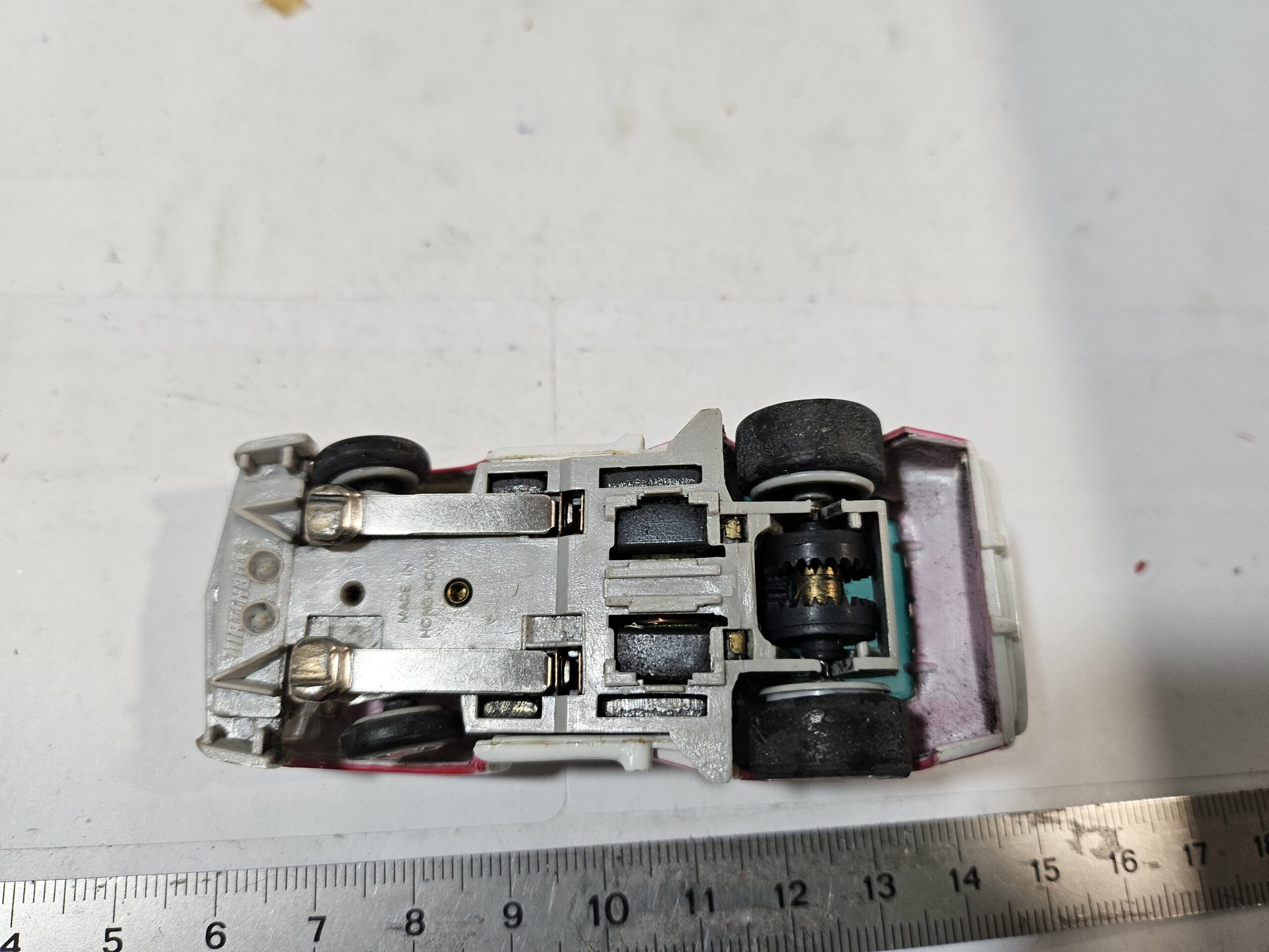 Châssis : Il s’agit d’un châssis MK4 (reconnaissable à sa configuration et ses frotteurs). C’est le châssis le plus performant et le plus recherché de la gamme Matchbox.